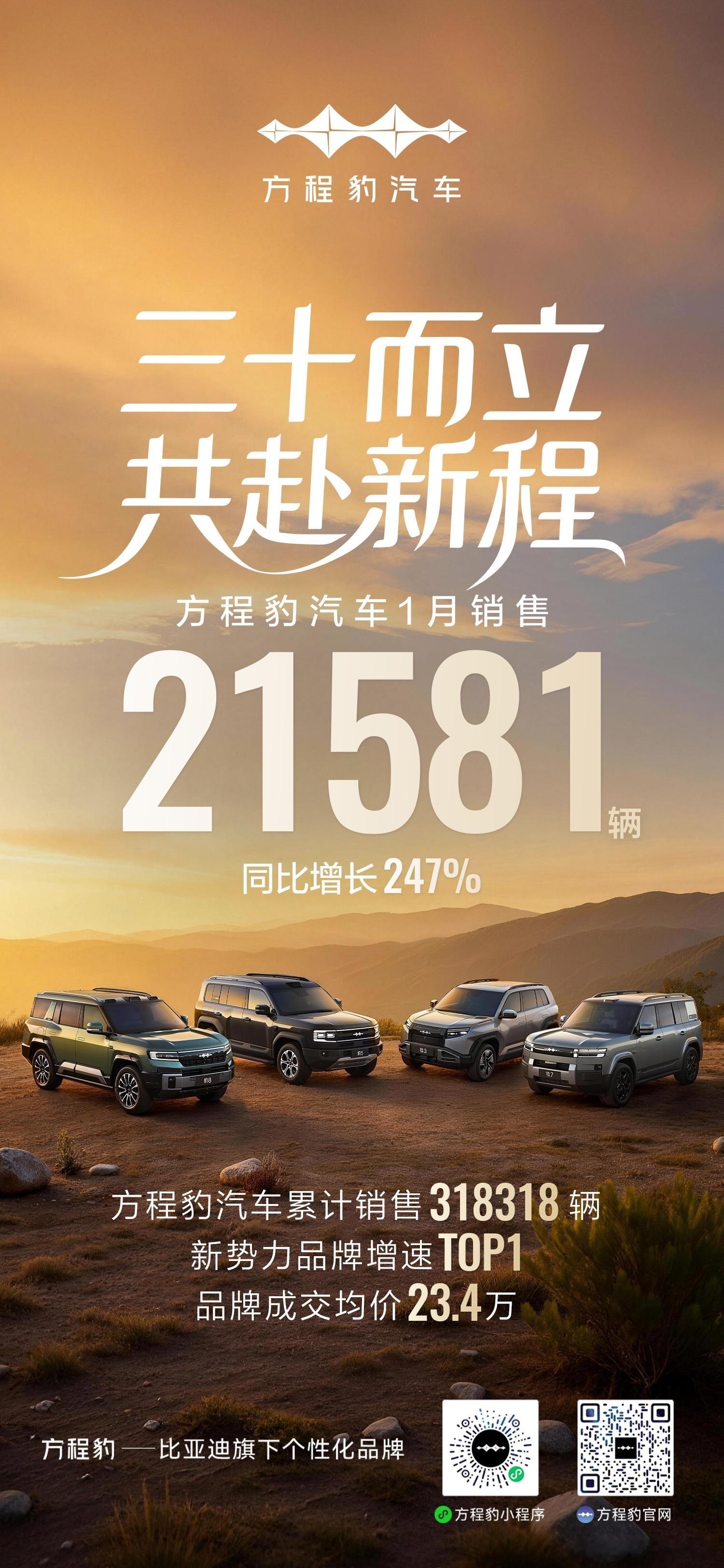 方程豹汽车1月销售21581辆 近日,方程豹汽车公布1月销量成绩,1月销售销售21581辆,同比增长247%。品牌累计销售318318辆,品牌成交均价23.4万元。新车情报局