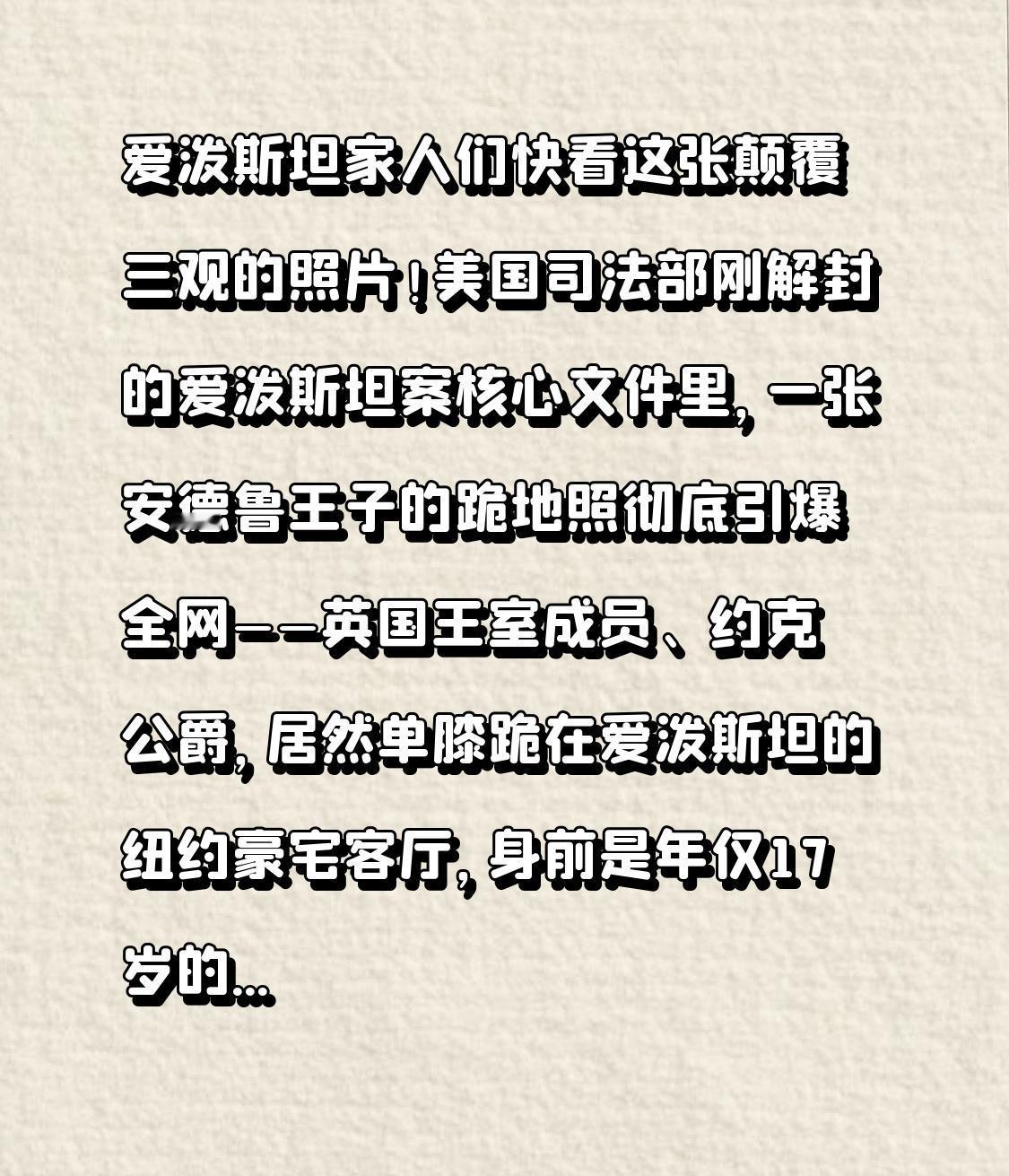 爱泼斯坦家人们快看这张颠覆三观的照片! 美国司法部刚解封的爱泼斯坦案核心文件里,一张安德鲁王子的跪地照彻底引爆全网——英国王室成员、约克公爵,居然单膝跪在爱泼斯坦的纽约豪宅客厅,身前是年仅17岁的受害者弗吉尼亚·朱弗雷,背景里还摆着那个被指控用于“操控”女孩的王子同款木偶!这张照片不是摆拍,而是受害者控诉“三次性侵”的关键物证,每一个细节都让人脊背发凉。 谁能想到,这位从小养尊处优的英国王子,会和“恶魔富商”爱泼斯坦绑定得如此之深。根据解封文件和受害者证词,2001年起,安德鲁多次出入爱泼斯坦的“萝莉岛”和纽约豪宅,不仅在沙发上与未成年女孩合影时伸手袭胸,还被指控参与集体性侵,甚至让受害者“像对待爱泼斯坦那样对待自己”,骨子里的特权傲慢溢于言表。更讽刺的是,他后来在BBC采访中狡辩“自己没有出汗的能力”“不记得见过受害者”,谎言漏洞百出,直接引发全民嘲讽。 但这起丑闻最颠覆认知的转折,远比照片更刺眼!2022年,安德鲁王子在铁证面前被迫与朱弗雷达成庭外和解,偷偷支付1200万英镑封口费,还公开承认“爱泼斯坦贩卖无数女孩”,变相默认了指控的真实性。可转头他就翻脸不认账,面对美国检方的问询,让律师拖延10个月拒绝当面作证,只肯接受“书面问询”,甚至逼得美国国会发传票、英国首相斯塔默亲自喊话“必须配合调查”。更让人寒心的是,关键证人朱弗雷在2025年4月离奇自杀,她用生命控诉的罪恶,差点就成了永远的秘密。 更魔幻的是王室的“切割戏码”:2025年10月,国王查尔斯三世为了保住王室声誉,火速剥夺安德鲁的所有尊号、头衔和军衔,把他赶出王室住所,一副“划清界限”的姿态。可事实是,安德鲁至今仍是英国王位继承人,拿着王室津贴,躲在特权保护壳里逃避法律制裁。而那些和爱泼斯坦有牵连的全球精英,大多只是名字被涂黑,没有一个人真正站上被告席。 法律专家直言,这张跪地照和解封文件,足以对安德鲁造成实质性法律打击,但“精英圈层的沉默”正在阻碍正义降临。1200万英镑能买到和解协议,却买不到受害者的原谅;王室除名能暂时平息舆论,却抹不掉犯下的罪孽。受害者朱弗雷曾说:“这不是桃色新闻,是活生生的性贩卖”,可直到她自杀,都没等到一句真正的道歉。 最后问问大家:你觉得安德鲁该被强制出庭作证吗?特权阶层该不该享有法外豁免?评论区聊聊你的看法,点赞关注,一起追问真相,不让任何一个受害者白白牺牲,不让特权成为罪恶的保护伞!案曝安德鲁王子跪地照
