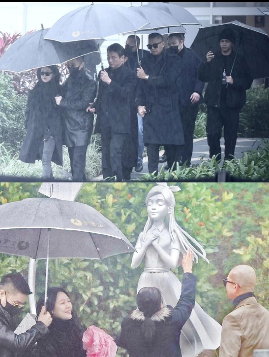泪目!大S雕像揭幕,前男友周渝民以及《流星花园》中的男友道明寺都来了! 2月2日,大S去世一周年之际,她的雕像在台湾省台北金宝山碑林名人区揭幕,这天天气不好,又下雨了,但众人还是打着伞到达现场。 现场来了不少明星,都是大S生前的好朋友以及最亲的人,包括小S、具俊晔、大S的妈妈黄春梅,还有黑人、范玮琪、罗志祥、周渝民和言承旭等。 其中周渝民和言承旭共同撑着一把伞,紧挨着相互搀扶着走了过来,两个人表情都很悲伤,一位是大S生前的男朋友周渝民,二人曾经谈过两年零5个月的恋爱,是真的谈过的那种,互相动心过,有过美好回忆。 一位是2000年拍《流星花园》时在剧中的男朋友言承旭,他在剧中演的是道明寺,而大S则是杉菜。 周渝民与大S谈恋爱的时候是2005年,那时的他们都是20多岁风华正茂,情窦初开的年纪,想必两位短暂的相处,留下了很美好的回忆。 如今大S去世一年了,周渝民恐怕是最难过的人之一吧。 大S的雕像是洁白的,是具俊晔亲自设计的,和大S生前年轻时的样子特别像。 总之,在这特殊的一天,众人打着伞,一起去给大S雕像揭幕,每个人脸上表情悲伤,想必大S九泉之下也会欣慰,因为她生前交了这么多好朋友,依然还记得她!