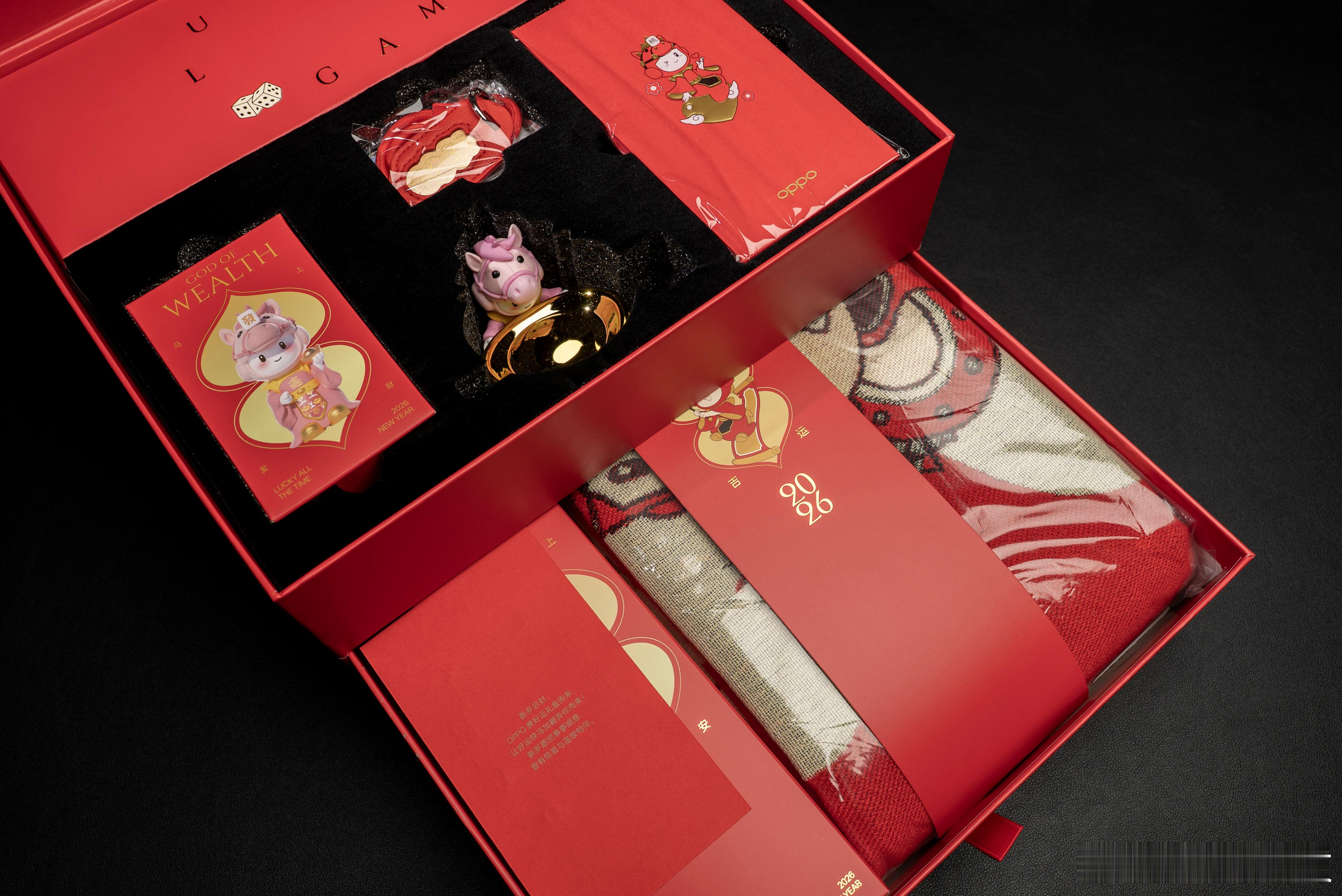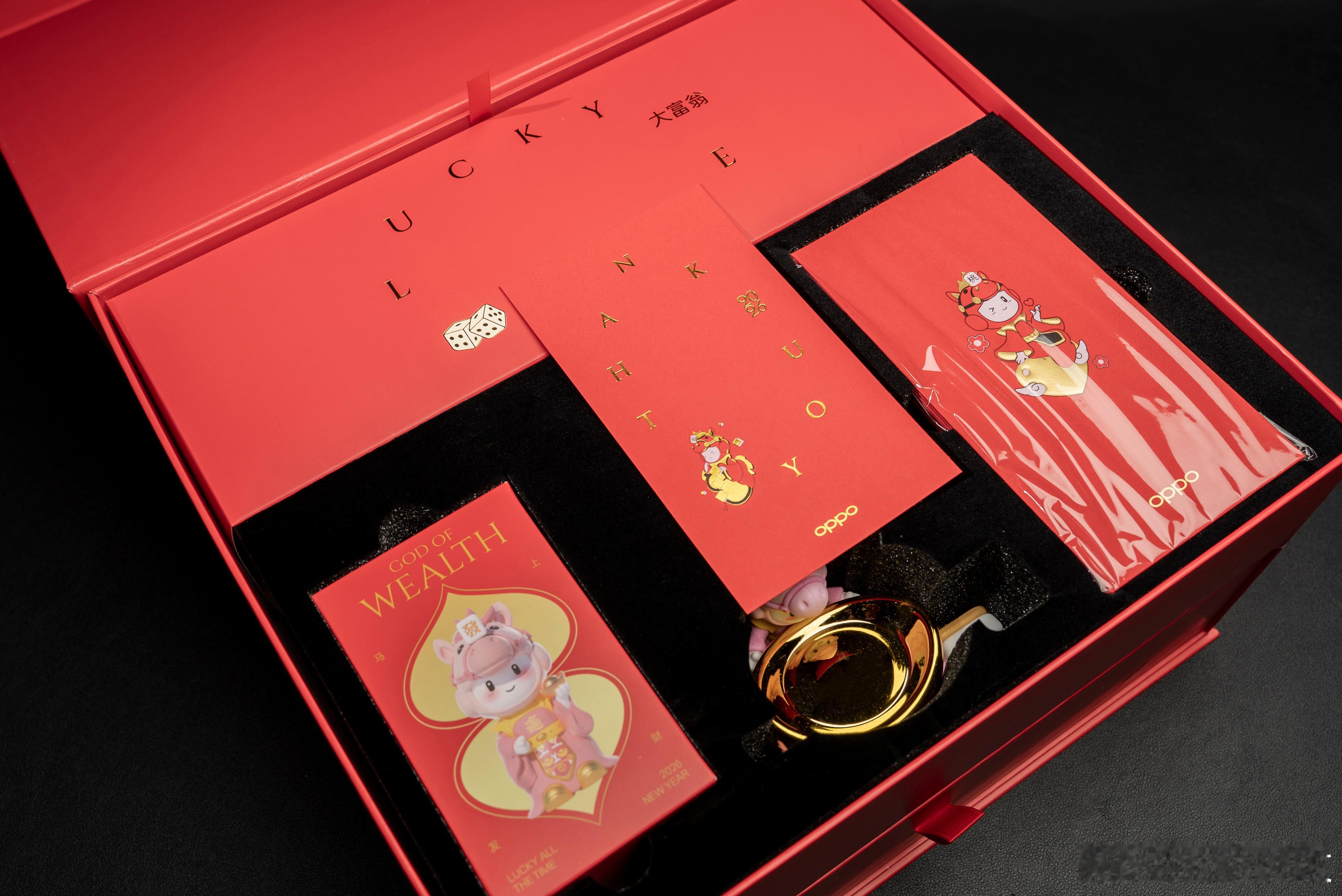 收到了OPPO寄来的新春礼盒,年味直接拉满。打开全是惊喜,今年的小欧手办直接化身成为了福马造型,套上居然还顶着一个“發”字,也是很应景了。最没想到的是……礼盒里居然还有一根纯金挂绳!(虽然只有0.35g,但金子总是很贵的,对吧?)OPPO每年的礼盒都十分有新意,喜庆感已经收到了。🐎🧧