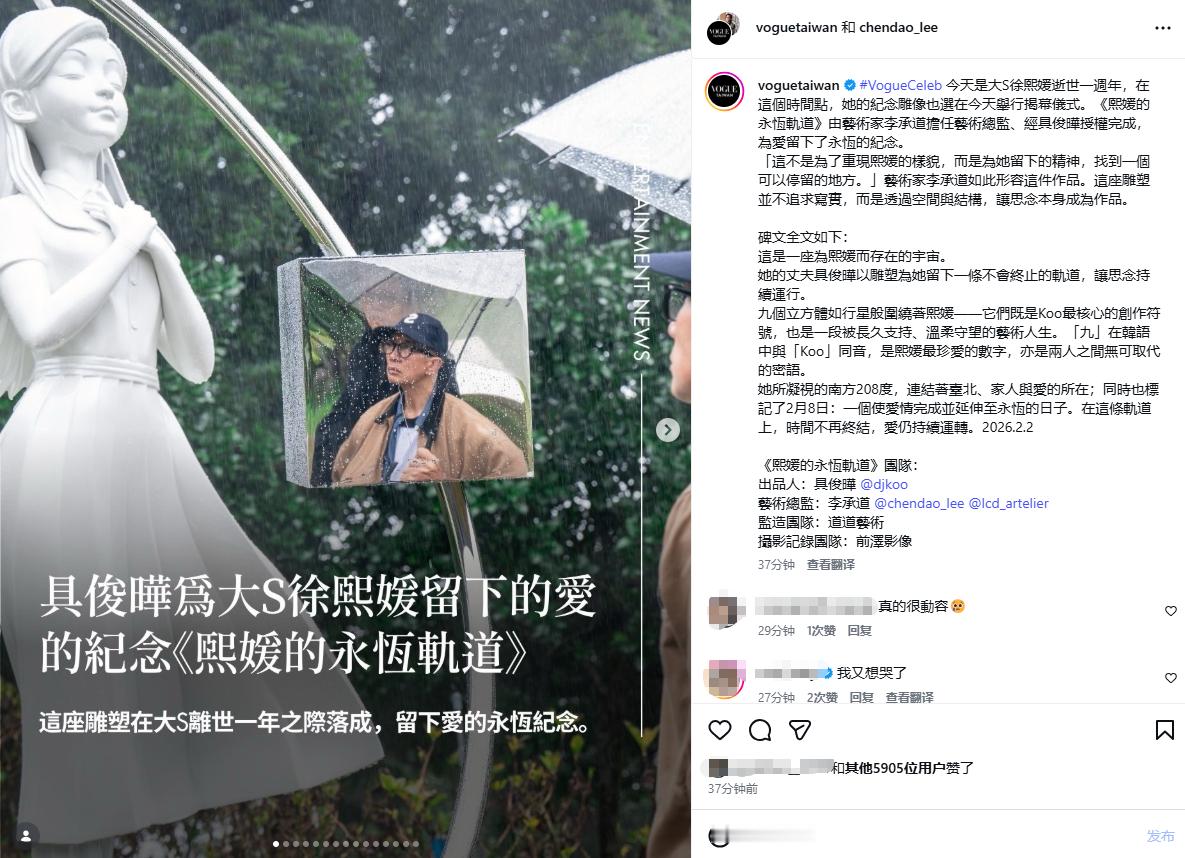 【艺术总监回应大S雕像不像大S】艺术总监回应大S雕像不写实争议 2月2日是大S徐熙媛逝世一周年,大S纪念雕像也在今日下午举行揭幕仪式。据Vogue台湾,《熙媛的永恒轨道》由艺术家李承道担任艺术总监、经具俊晔授权完成,为爱留下了永恒的纪念。“这不是为了重现熙媛的样貌,而是为她留下的精神,找到一个可以停留的地方。”艺术家李承道如此形容这件作品。这座雕塑并不追求写实,而是透过空间与结构,让思念本身成为作品。碑文全文如下↓