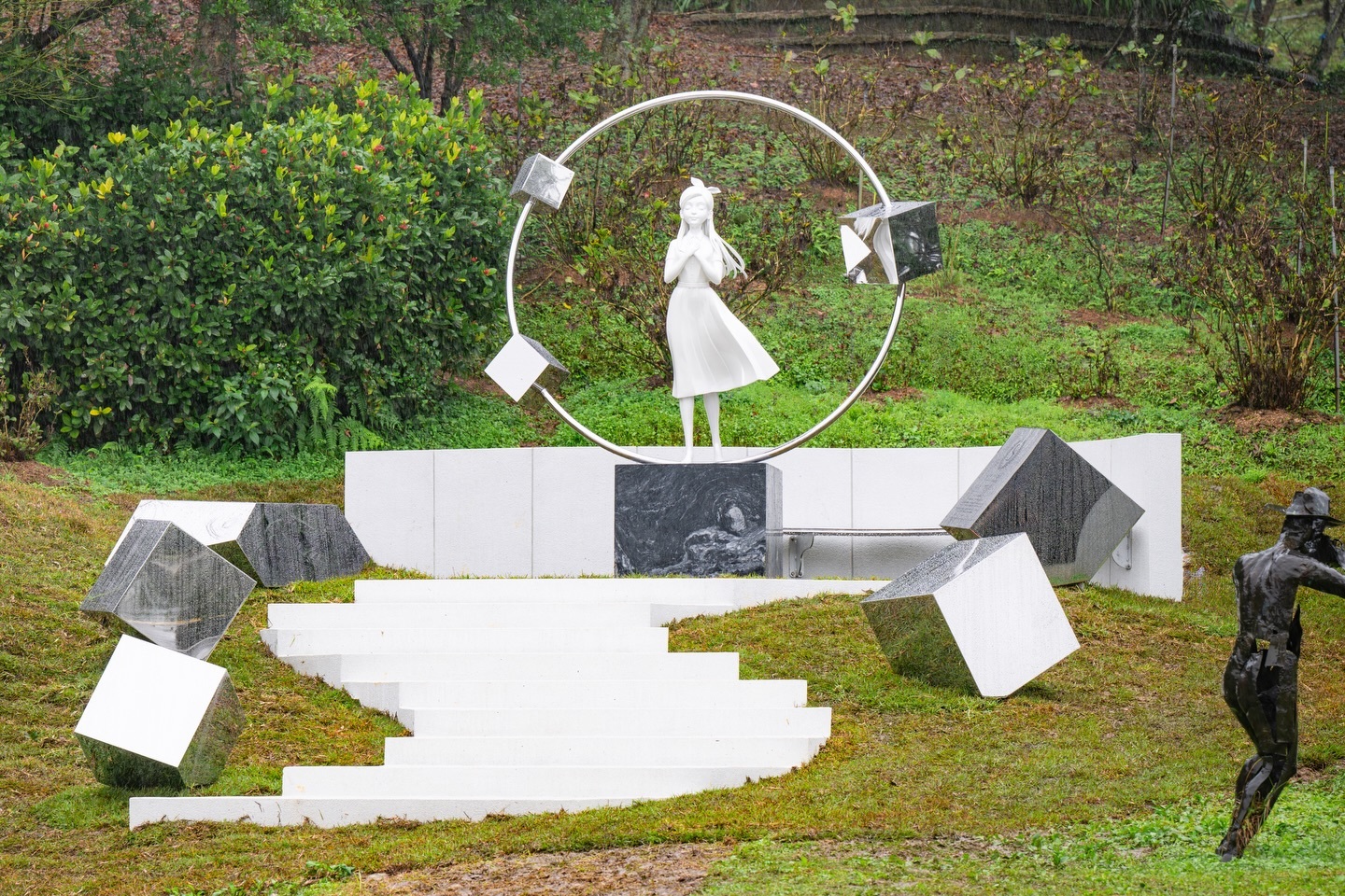 碑文全文如下:这是一座为熙媛而存在的宇宙。她的丈夫具俊晔以雕塑为她留下一条不会终止的轨道,让思念持续运行。九个立方体如行星般围绕着熙媛—它们既是Koo最核心的创作符号,也是一段被长久支持、温柔守护的艺术人生。「九」在韩语中与「Koo」同音,是熙媛最珍爱的数字,亦是两人之间无可取代的密语。她所凝视的南方208度,连结着台北、家人与爱的所在;同时也标记了2月8日:一个使爱情完成并延伸至永恒的日子。在这条轨道上,时间不再终结,爱仍持续运转。2026.2.2