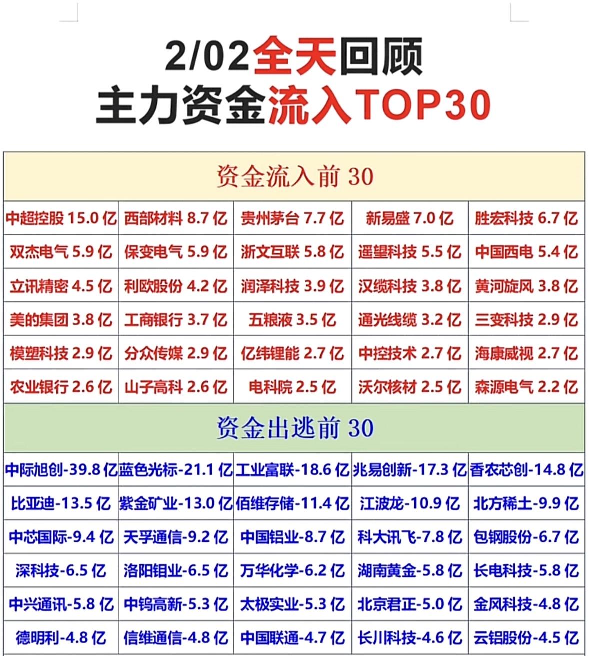 2月2日主力资金流入流出TOP30,快来看看谁在涨谁在跌!💰📈📉 主力资金青睐中超控股等股,茅台五粮液受捧;中际旭创等遭大幅抛售,市场分化明显。