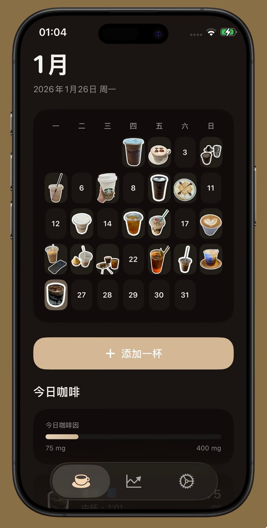可以记录每天的咖啡、了解每日咖啡因摄入、为每一杯咖啡添加精美咖啡贴图、查看周/月/年咖啡统计。
