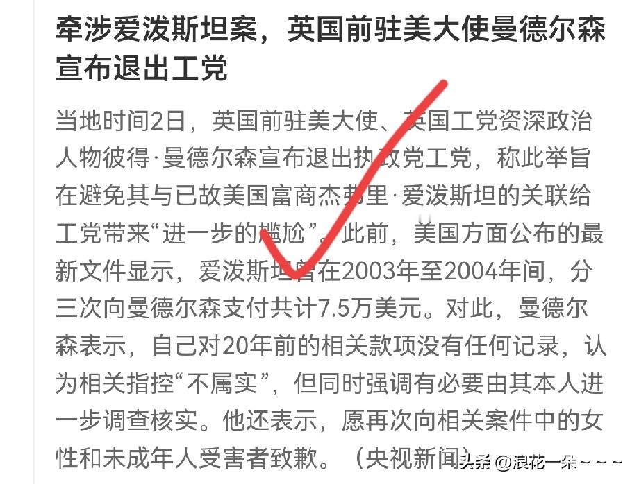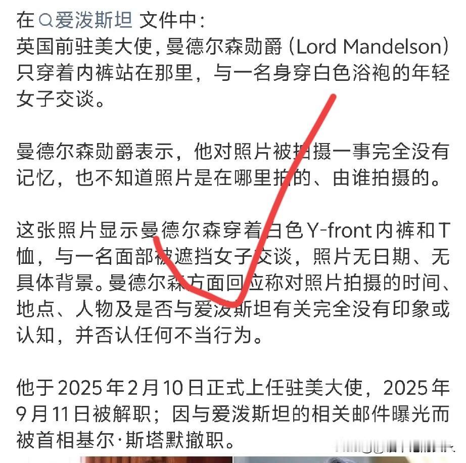 呵呵!证实了?![击掌] 算是倒下了一个吧?就在刚刚,因牵涉爱泼斯坦案,英国前驻美大使曼德尔森宣布退出工党! 在我看来,这应该算是证实曼德尔森在担任驻美大使的时候混进了爱泼斯坦的圈子。 其实,看看图一就知道了,这太不正常了,穿这个内裤也不知道在干嘛。据说这女的也挺有来头呢? 虽然曼德尔森还试图辩解,但证据就摆在这里,有理说不清啊,也算是给英国工党丢了大脸了。