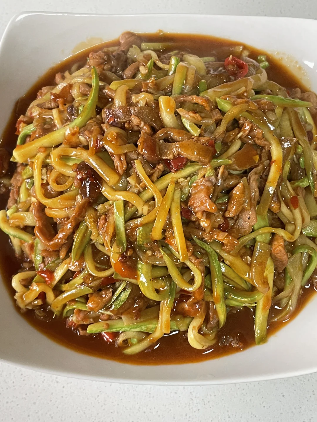 姐妹们,今天给大家出一个巨下饭的下饭菜,西葫芦炒肉丝。因为我买的是梅花肉,所以也有肥肉,因为我比较喜欢吃这种肥肉,炒熟很香,喜欢的姐妹可以尝试一下。