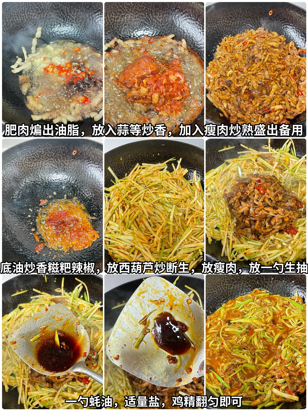 3⃣️起锅烧油,油热将肥肉煸炒出油脂,加入一点老抽炒上色,放入蒜、小米辣、花椒炒出香味,倒入瘦肉炒熟盛出。锅里留底油,放入西葫芦炒断生,倒入瘦肉,加入一勺生抽,一勺蚝油,适量的鸡精,盐,翻匀即可出锅。这样做出来的西葫芦炒肉丝光汤汁都能拌一碗米饭,喜欢的姐妹试试吧