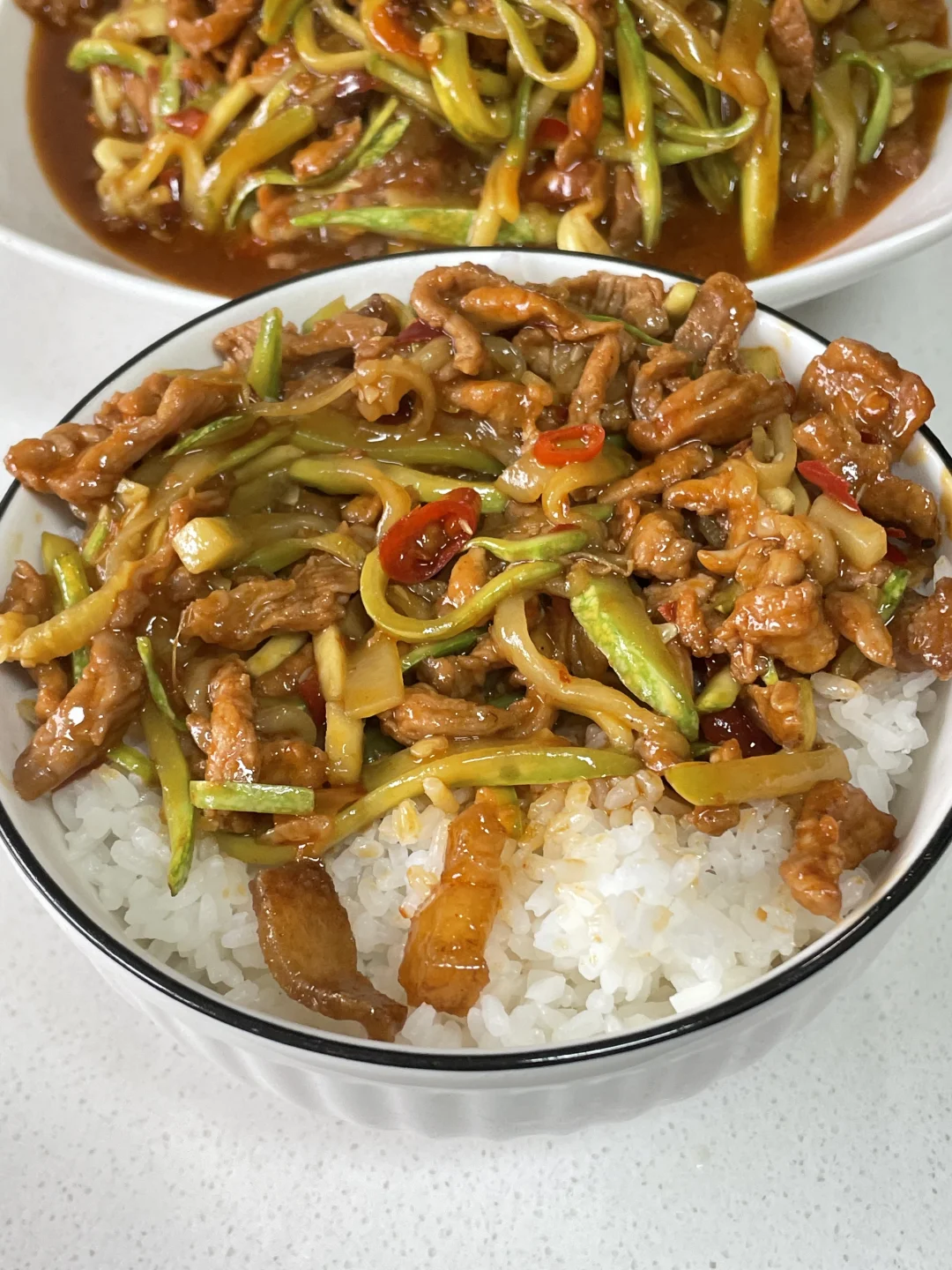 1⃣️肥肉切小条备用,瘦肉切丝,放入豆瓣酱、生抽、胡椒粉、淀粉、豆瓣酱抓匀,腌制10分钟备用,