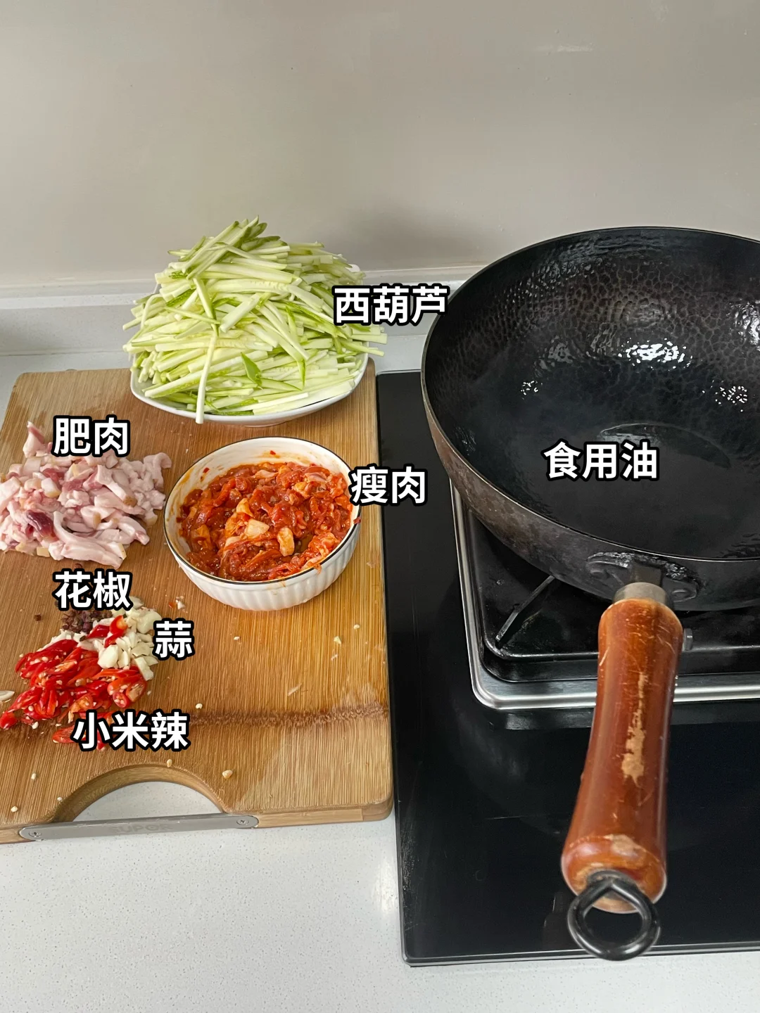2⃣️西葫芦切丝,准备一些小米辣、蒜、糍粑辣椒、花椒。