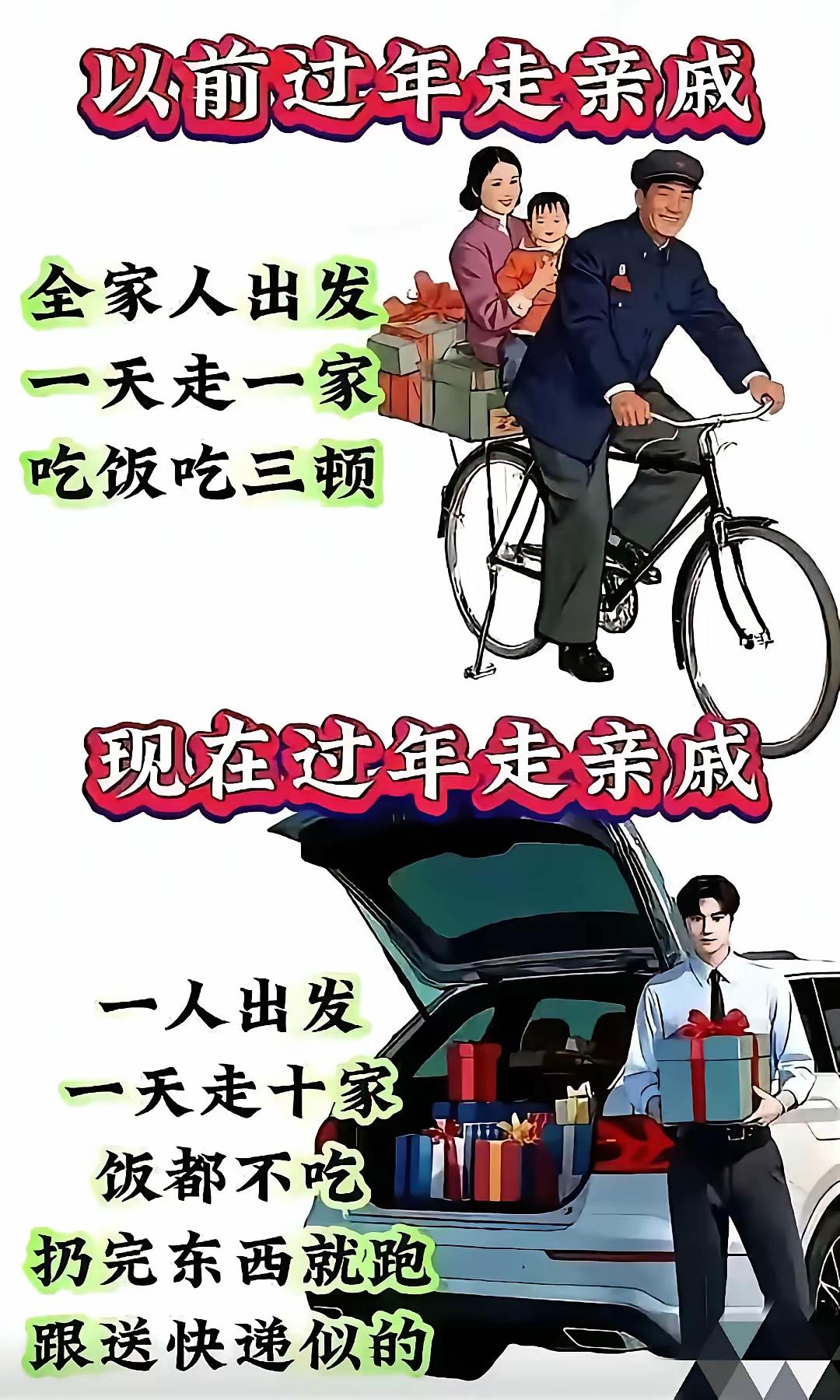 过年走亲戚,放在以前大家就是走心,而现代就是为了走形式。 这就是走亲戚串门的区别。 以前是通信落后交通也落后不方便。现在是通信发达交通发达,没有那种久别重逢的感觉了。