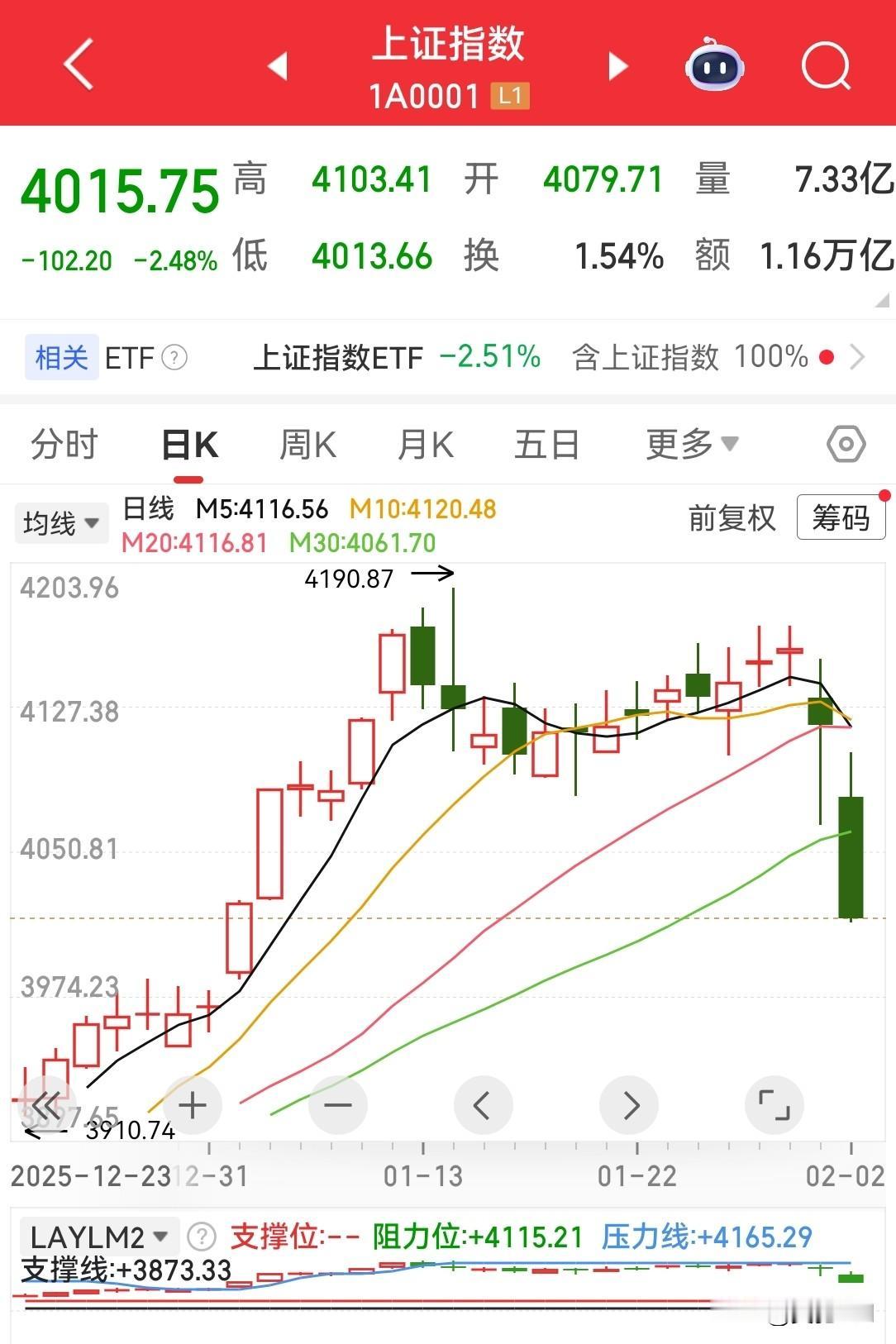 今天的暴跌无疑给整个二月的行情来了当头一棒!庆幸自己目前是一半仓位,而且手上以商业航天票为主,上午红盘的时候给了离场机会并执行了,所以全天损失不大,出掉的商业航天票尾盘还接了回来。 今天跌停的场面有点吓人,有色金属和能源类票很多都是一字跌停并且有巨大封单,这样的话这个板块明天仍不乐观。 明后两天的行情很关键,明天再继续暴跌可能性不大,很可能是个弱反弹,也许是个逃命机会,也许再诱多一天,但总体而言目前不乐观,总之明天如果反弹力度不大的话我就再减仓,因为今天整个趋势已经变坏,三日内如果没有量反包,那就坚定离场。4000点是个支撑,3950是最后的防线。