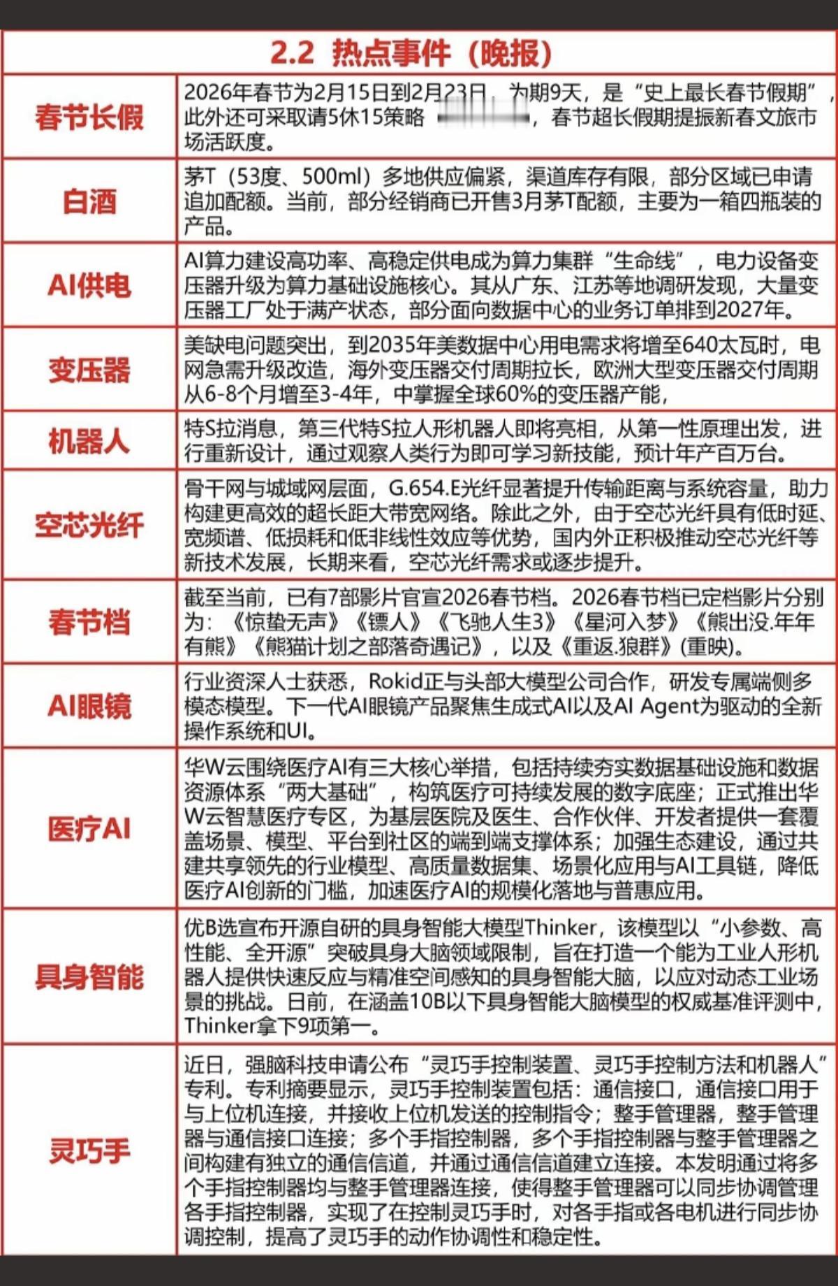 2.2周一 晚间 财经信息汇总! 1.变压器 2.供电AI 3.人工智能AI眼镜、AI医疗 4.具身智能 5.机器人,灵巧手