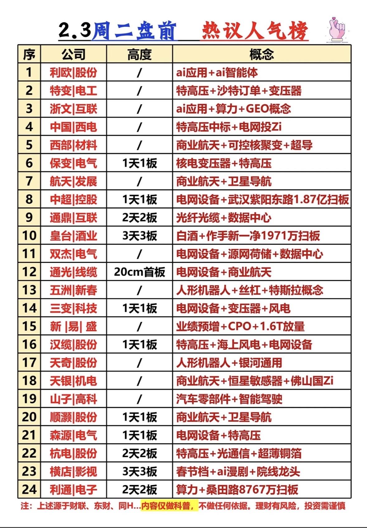 2.3周二盘前热议人气榜,带你了解热门概念股!📈📈📈 周二盘前热点:AI应用、特高压、商业航天、人形机器人、白酒等板块活跃,多股涨停,投资需谨慎。