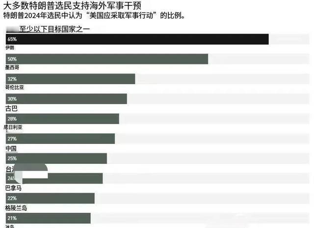 美国最新民调出炉,超六成选民支持特朗普对外动武,25%希望攻打中国,美国开始穷兵独武!当地时间28日,美国《政治报》公布了一项民调数据:在受访的2093名特朗普选民中,有65%的人支持美国至少在一个“目标国”采取军事行动。 这项民调由《政治报》与Public First合作,在2026年1月16日至19日在线调查2093名特朗普2024年选民,按人口统计加权,误差±2%。调查针对伊朗、格陵兰、古巴、哥伦比亚、中国、墨西哥等国军事态度,65%赞成至少一国动武,显示从反海外战争转向支持短暂干预。 伊朗支持率50%,MAGA群体61%。墨西哥32%,针对贩毒集团。哥伦比亚30%,打击毒品。古巴28%,推动变革。中国25%,反映对抗倾向。格陵兰21%,曾有收购威胁。 哈里斯选民仅18%支持伊朗动武,党派差距明显。背景是特朗普就职后委内瑞拉行动成功,零伤亡逮捕领导人,提升支持者对快速打击信心。2026年1月部署航母群到波斯湾,威胁伊朗核谈判。 中国支持率与贸易南海问题相关,受访者提及知识产权和台湾议题。格陵兰回忆2025年丹麦访问购岛遭拒,转经济合作。古巴哥伦比亚涉及移民毒品,视军事为阻断来源。 民调区分短期突击与长期占领,偏好前者。委内瑞拉后信心增加,但整体美国人分歧大,如其他民调70%反对伊朗动武。党派中共和党83%支持委内瑞拉,民主党14%。 特朗普利用民调强化伊朗压力,部署亚伯拉罕·林肯号航母群。欧洲反对市场波动下,未推进格陵兰军事。MAGA对伊朗更高支持,非MAGA对墨西哥22%。 转变源于委内瑞拉零伤亡成功。移民驱逐和拉美行动背景中,对中国态度受经济竞争影响。伊朗抗议升级推动50%支持率。