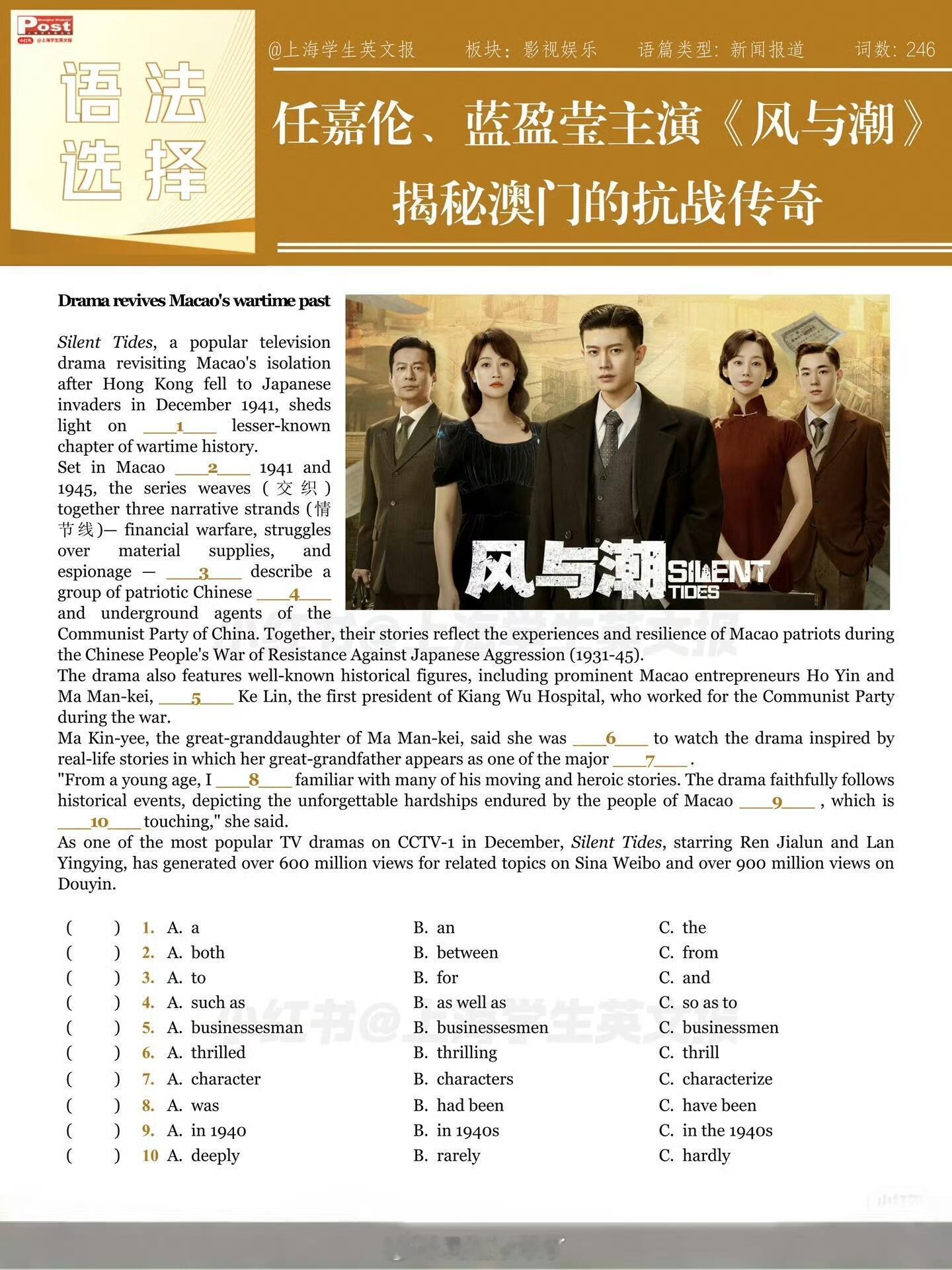 任嘉伦《风与潮》完形填空题又登上英文报了