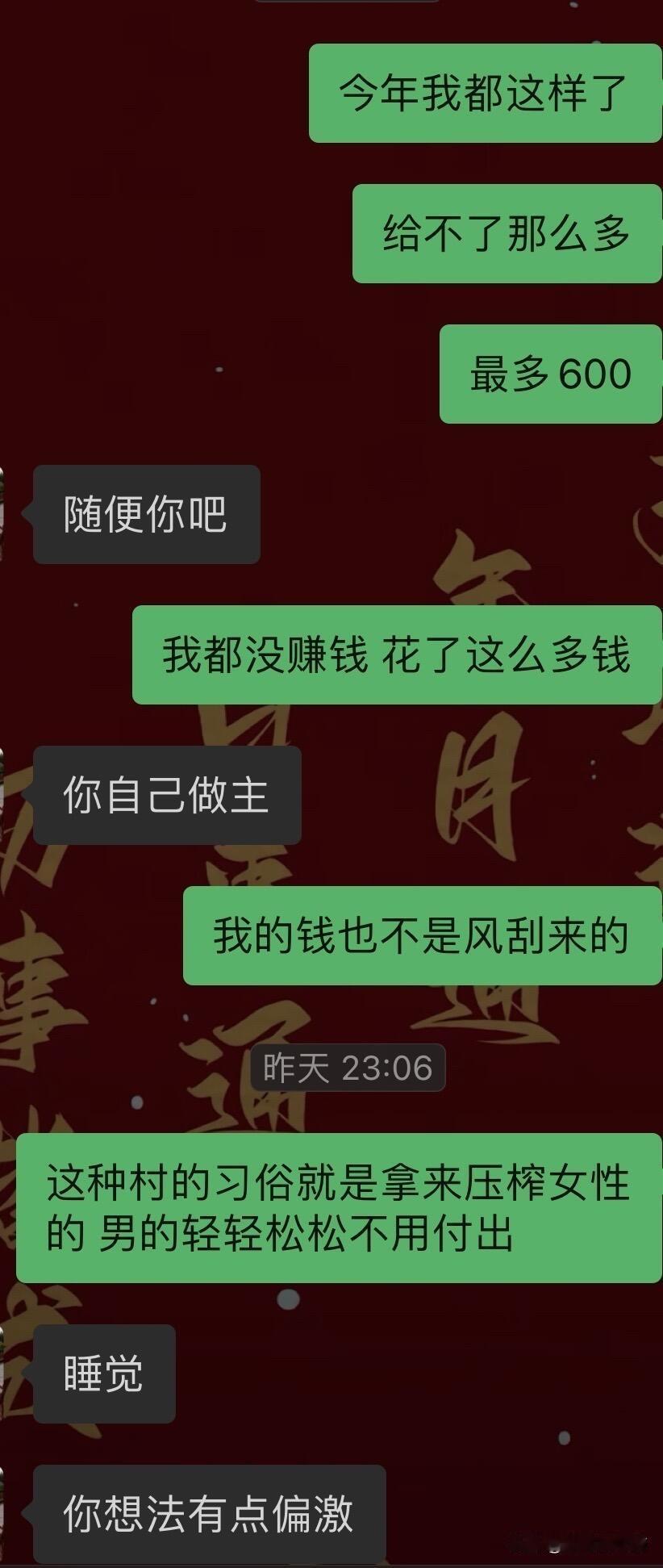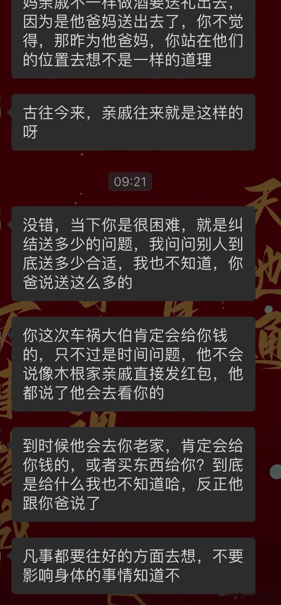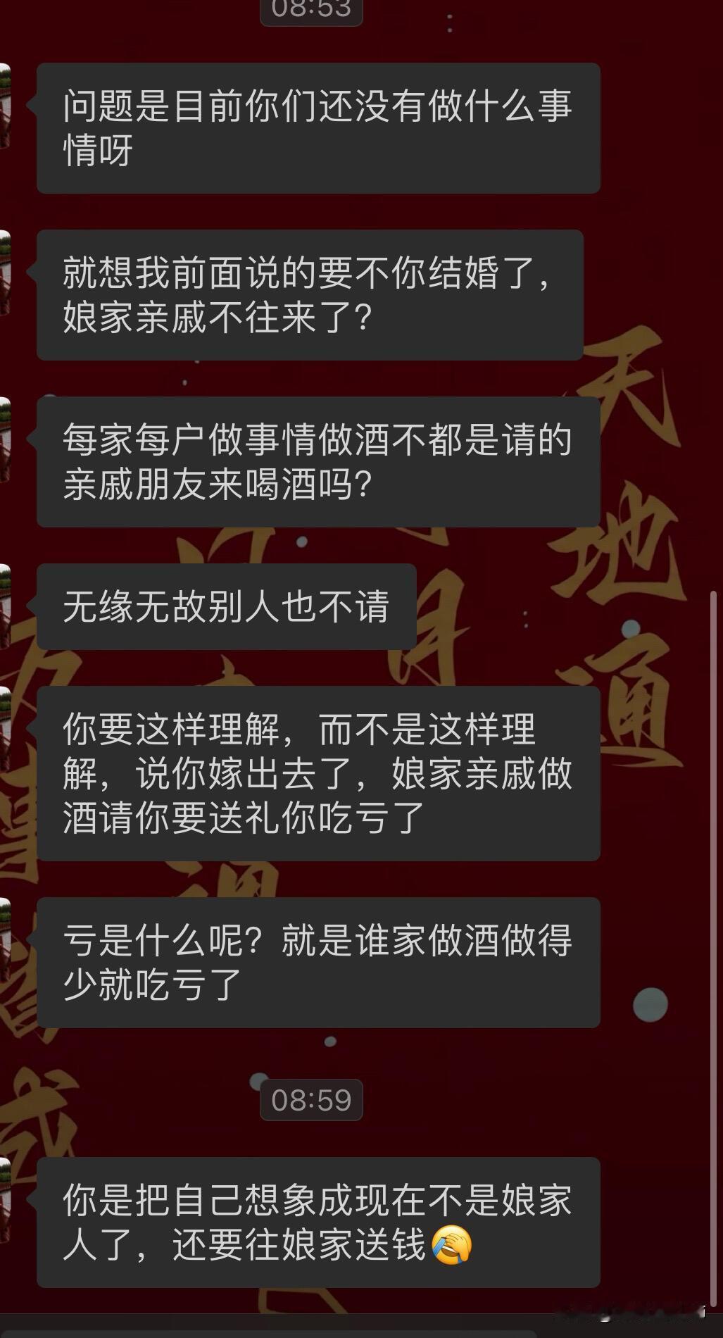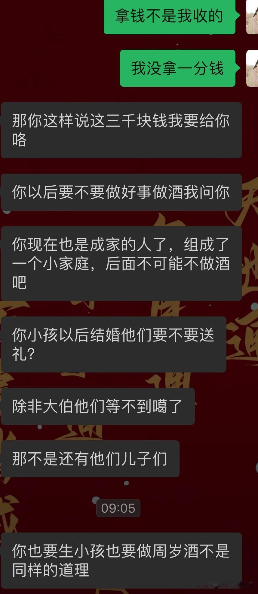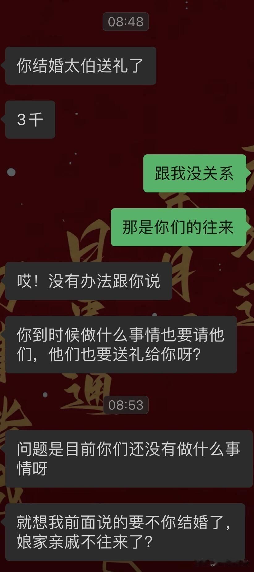 嫁出去的女儿必须给娘家亲戚随礼吗? 我老家是江西的,今年出了一场车祸,进来ICU做了开颅手术,工作也没了,然后花了好多积蓄在医院。现在已经恢复差不多了,正值年底我堂哥儿子的周岁酒,就因为我嫁出去了就得给他们随礼,不然关系就断了。而且我爸妈建议给随800。等于他们的怀孕酒和周岁酒一起办的,所以需要给两份份子钱两个400折合起来就是800。想想我嫁出去,这些年已经往娘家亲戚随了好多里,最后我却一分都没落着。我堂哥结婚的时候我又被我爸妈建议说给他们多随点说得1000以上,然后当时我并没有随那么多,我就随了800,因为我结婚的时候我并没有收到过他们给我的礼金,我结婚的时候我大伯给了我爸妈3000块钱份子钱,但是跟我一点关系都没有,没有在我手。然后往后我大堂哥如果又要办周岁九的话,我可能又要随礼。还有我记得我结婚的时候,我爸妈还建议我给我弟弟和妹妹发红包呢,可是那是我结婚,我不应该收到红包吗?为什么我要给弟妹发红包呢?所以当时结婚当天我也没想太多没拒绝我就给了我弟和我妹一人一个小红包,我理解不了,然后我结婚第一年回娘家拜年的时候给娘家刚出生的小孩压岁钱完了还被要求我还得给我弟钱,因为我弟当时还在上大学,没有工作,结婚第一年是该给娘家红包的,而我把第一年从婆家收到的红包全都给娘家了,反正是各种各样的情况,他们需要收我的红包,我不给的话,不然就等于是断联系了。回想起以往种种就觉得心里堵得慌,再加上从小也是在重男轻女的阴影下长大的,也不知道是不是我想太多了。