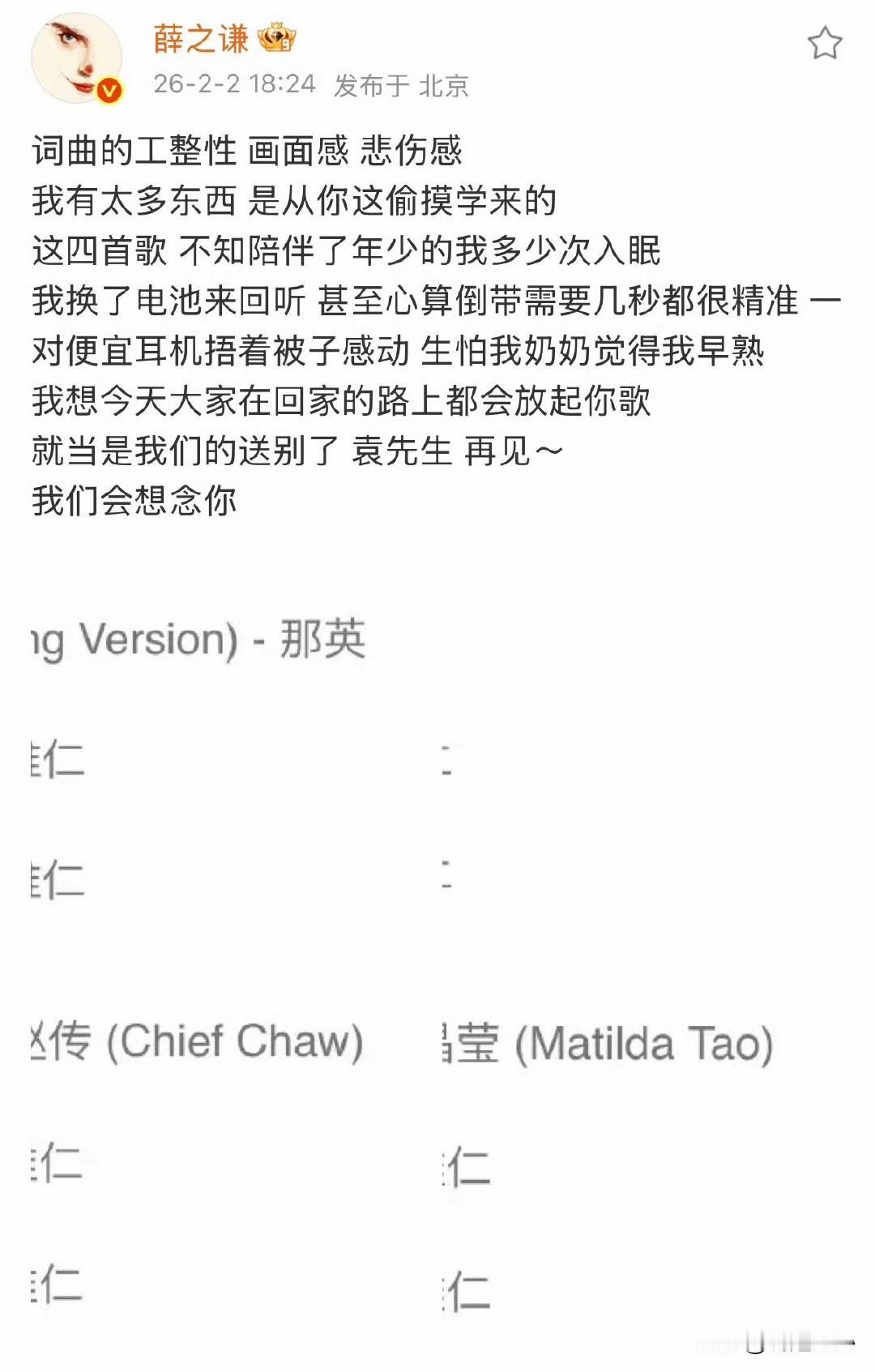 2月2日,薛之谦发文悼念袁惟仁,他说:袁先生再见,袁惟仁创作的《梦一场》《勇敢一点》《离开我》《征服》四首歌陪伴了我的年少时光,有太多东西是从他这偷摸学来的,他创作了很多经典作品。 薛之谦是2018年认识的袁惟仁,在《嗨唱起来》节目中。薛之谦说袁惟仁是“从小到大”的偶像,正是因为听了《征服》《梦一场》这些歌才决定进入音乐行业。袁惟仁对薛之谦说“我很喜欢薛之谦,他具备华语创作最重要的部分,希望与薛之谦合作。 没想到8年过去,薛之谦再次接到袁惟仁的消息,居然因为脑部疾病去世,实在是太过悲痛了,简直就是天妒英才。