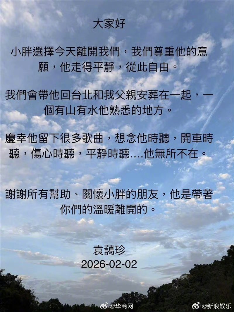 #袁惟仁去世##袁惟仁讣告# 据台媒,著名歌手、音乐制作人袁惟仁去世,享年57岁。姐姐袁蔼珍代表家属发文:“我们会带他回台北,与我父亲合葬在一起,一个有山有水、他熟悉的地方。庆幸他留下了众多歌曲,想念时听,开车时听,伤心时听,平静时听……他无处不在。” 也发文悼念:“R.I.P 小胖。”