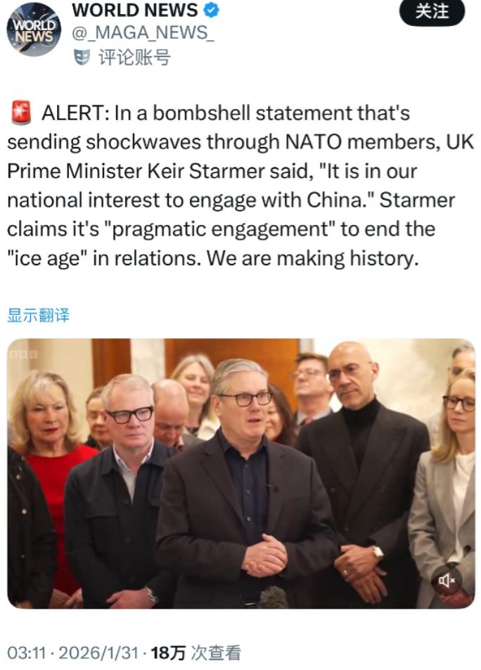 北约成员国有些震惊了,之前不是一直渲染“中国威胁论”吗?怎么斯塔默的风向一下子转变了?英国首相斯塔默发表重磅声明,他宣称英国与中国接触符合自己国家的利益,同时还表示这是“务实的接触”。 首先咱们要清楚一件事情,那便是欧洲国家一直与美国走得比较近,而如今越来越多的欧洲国家开始访华,试图缓和与中国的关系。 他们能这么做,大概率就是看到了如今的中国今非昔比,国力的提升让我们在国际上有了更足的底气。 或许斯塔默来中国之前,也抱有模棱两可的态度,但来到中国后,估计他已经彻底折服了。 毕竟中方给到英国的平等互利,是美国难以给到欧洲国家的。 而美国除了把自己利益放在第一位之外,特朗普还对“盟友”的土地有了想法,尤其是格陵兰岛。 可以这么说,如今越来越多的国家原意与中国合作,而美国若是继续这样下去,那么他们很可能会被越来越多的国家所“孤立”。