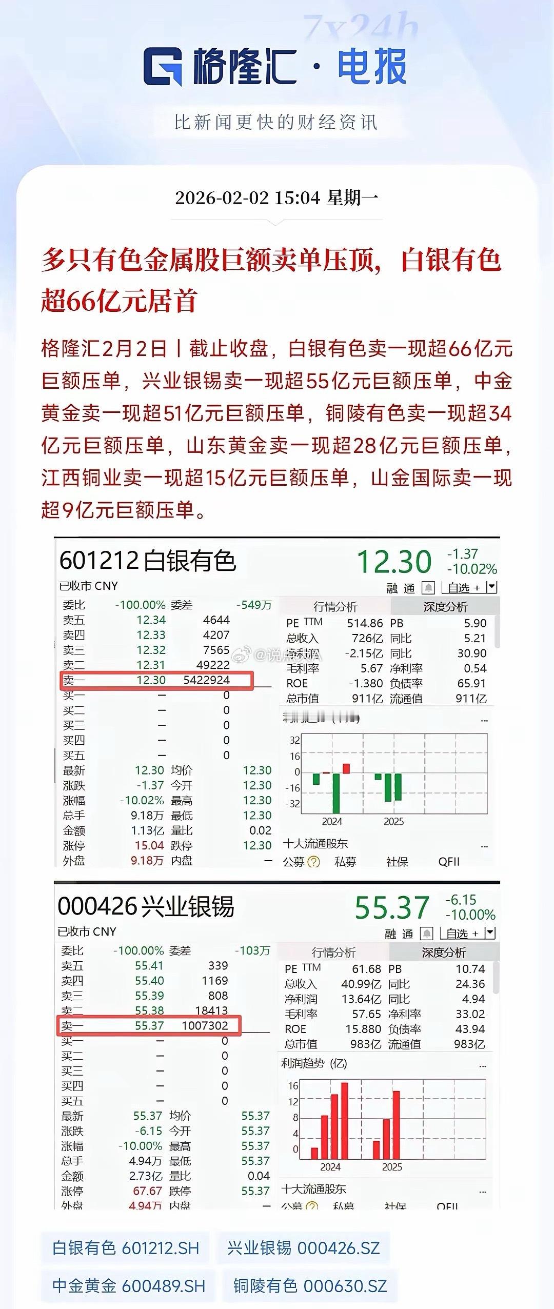 今天A谷大跌的原因很明了,贵金属不止跌停到了尾盘还有巨幅大额压单今天大跌的原因不用说也知道,就是贵金属再次暴跌,现货黄金和白银目前暴跌4.46%,7.96%,已经连续两天暴跌。A股的黄金股票和白银相关也是暴跌,黄金ETF直接跌停了,完全不给市场任何反弹的机会,直接带崩了情绪面,造成恐慌性抛盘。关键的在于收盘还有大额压单,白银有色尾盘遭66亿巨额资金压单,江西铜业,铜陵有色都有大额压单,这和前几天的大额压单老登股何其相似,就是不让涨。现在大涨是不可能了,大跌出现了,现在就看政策面了,禁止大涨大跌是刚提出来的。