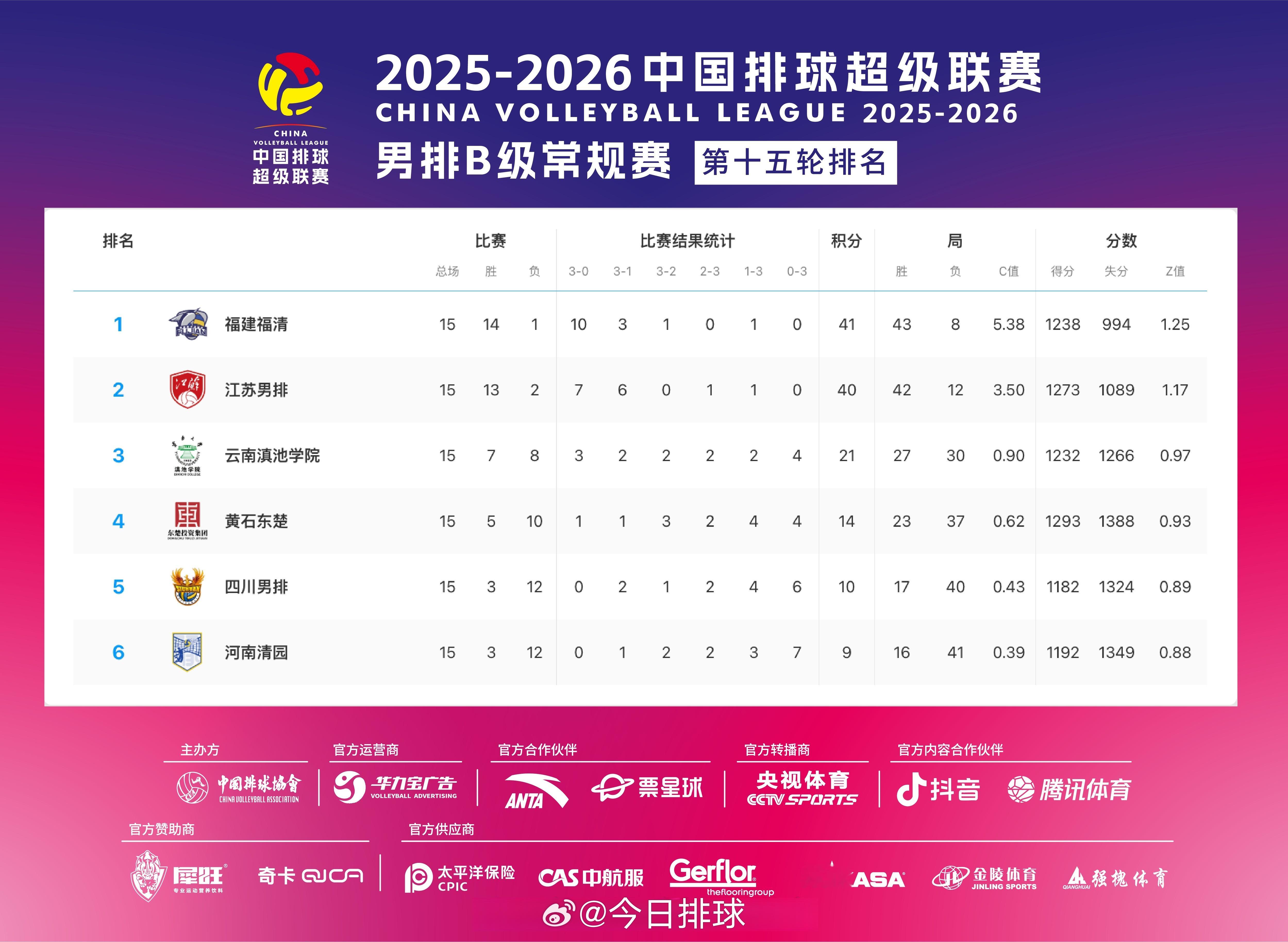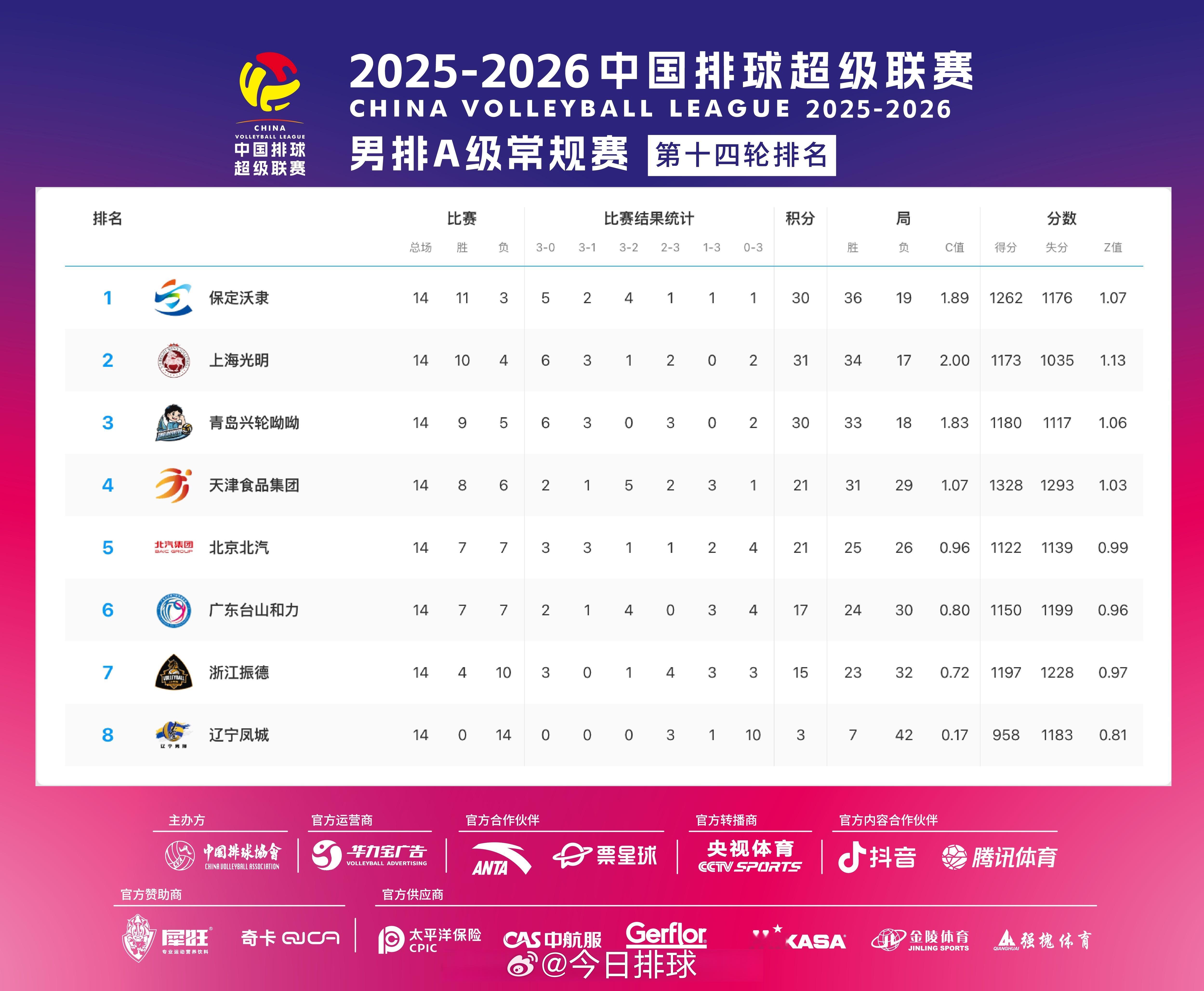 2025-2026中国男排超级联赛 A级和B级常规赛第14轮、B级常规赛第15轮比赛结果,及常规赛结束后A级和B级的积分排名。赛中升降级赛对阵:浙江vs江苏、辽宁vs福建。