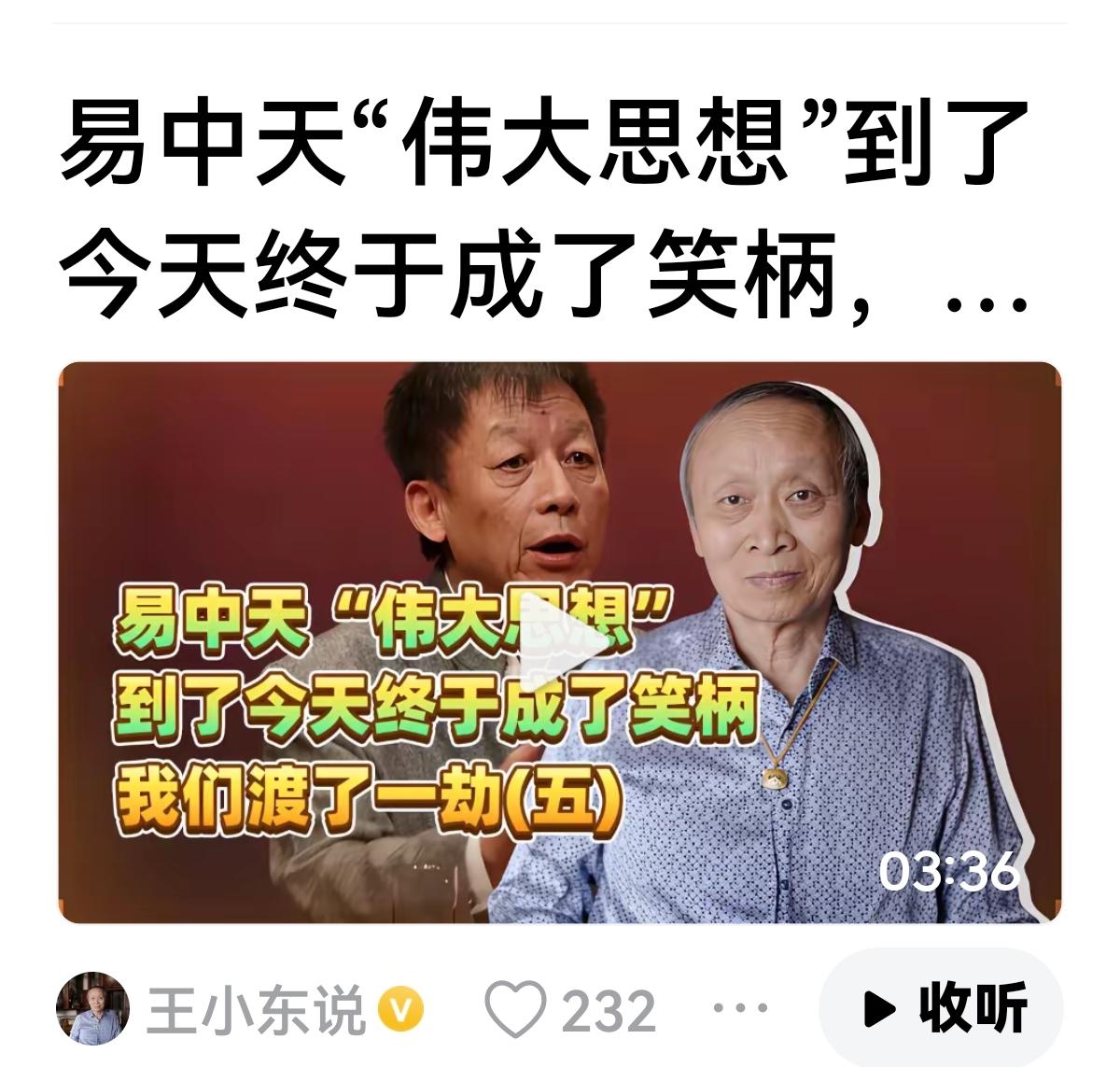 【看来王小东真的成为笑柄】 易中天的电影扑街,王小东归纳为资本投资错误,更好玩是他质疑易中天为何能红?责怪是媒体捧红的。 甚至说易中天这次电影扑街是他奋斗四十年的成功。 电影这东西本来就有变数,扑街与赚钱都是有偶然性,当年走投无路的吴宇森,在徐克帮助下,由于经费紧张,找到落魄的狄龙,寂寞无名的发哥,为了确保有人投资,咬牙签约张国荣,谁想到开创港片警匪片英雄本色。 易中天的扑街,有很多因素,怎么成了王小东口中众人所向?如果一部电影的扑街标志风向是不是太幼稚?更可笑他为之奋斗四十年是不是笑柄? 当然,吴京的电影扑街是由于自己飘了,加之以前电影新鲜过去了,双重压力下扑街。 谁也没有分析出扑街与个人奋斗挂钩啊,自己成为最大笑柄。
