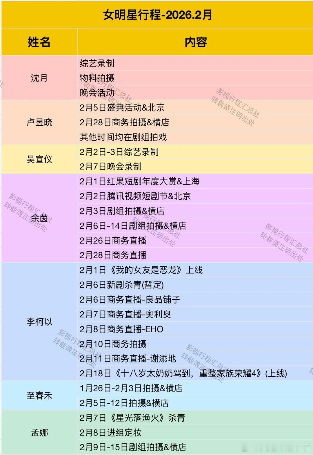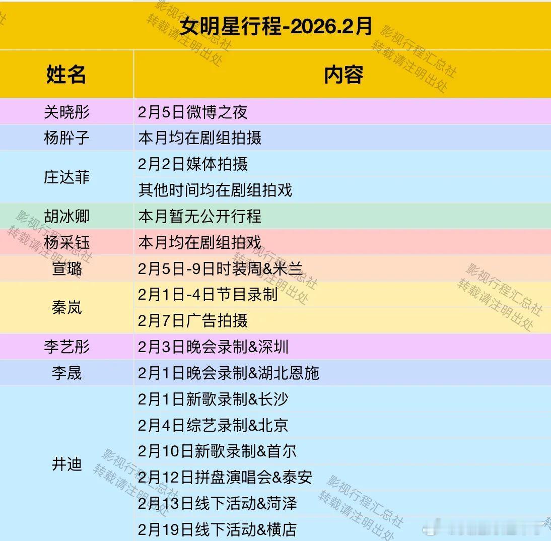 2026年2月女明星行程第二弹蒋梦婕 孟佳 哈尼克孜 安琪 张俪 梁洁 王子文 迪丽热巴 陈妍希 王子璇 章若楠 李雪琴 沈月 吴宣仪 卢昱晓 余茵 李柯以 孟娜 翟一莹 韩雨桐 毛晓彤 娜扎 文琪 邓恩熙 袁维娅 唐嫣 关晓彤 庄达菲 胡冰卿 杨采钰 李艺彤