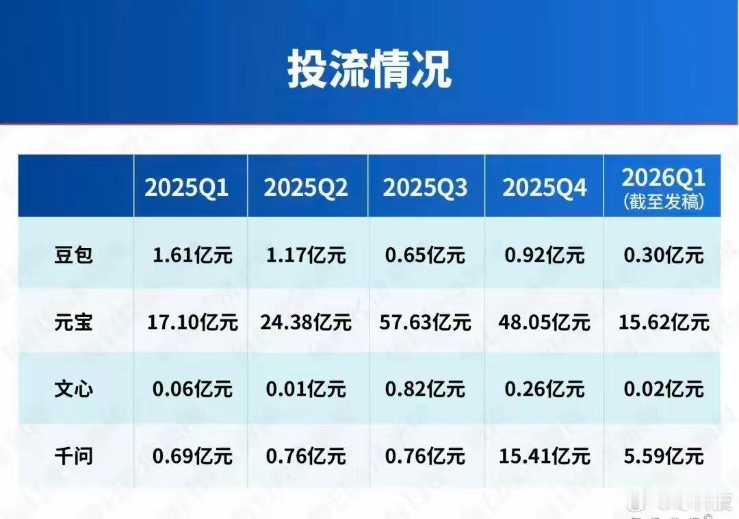 马化腾这个钱没白砸,这个春节BAT三巨头应该要在AI上正面火拼了。字节占据先发优势,投流最少。腾讯元宝,马化腾直接表示烧出一个未来。阿里的千问虽然起步晚,但最近发力确实猛。百度的文心虽然占据先发优势,但懂的都懂。