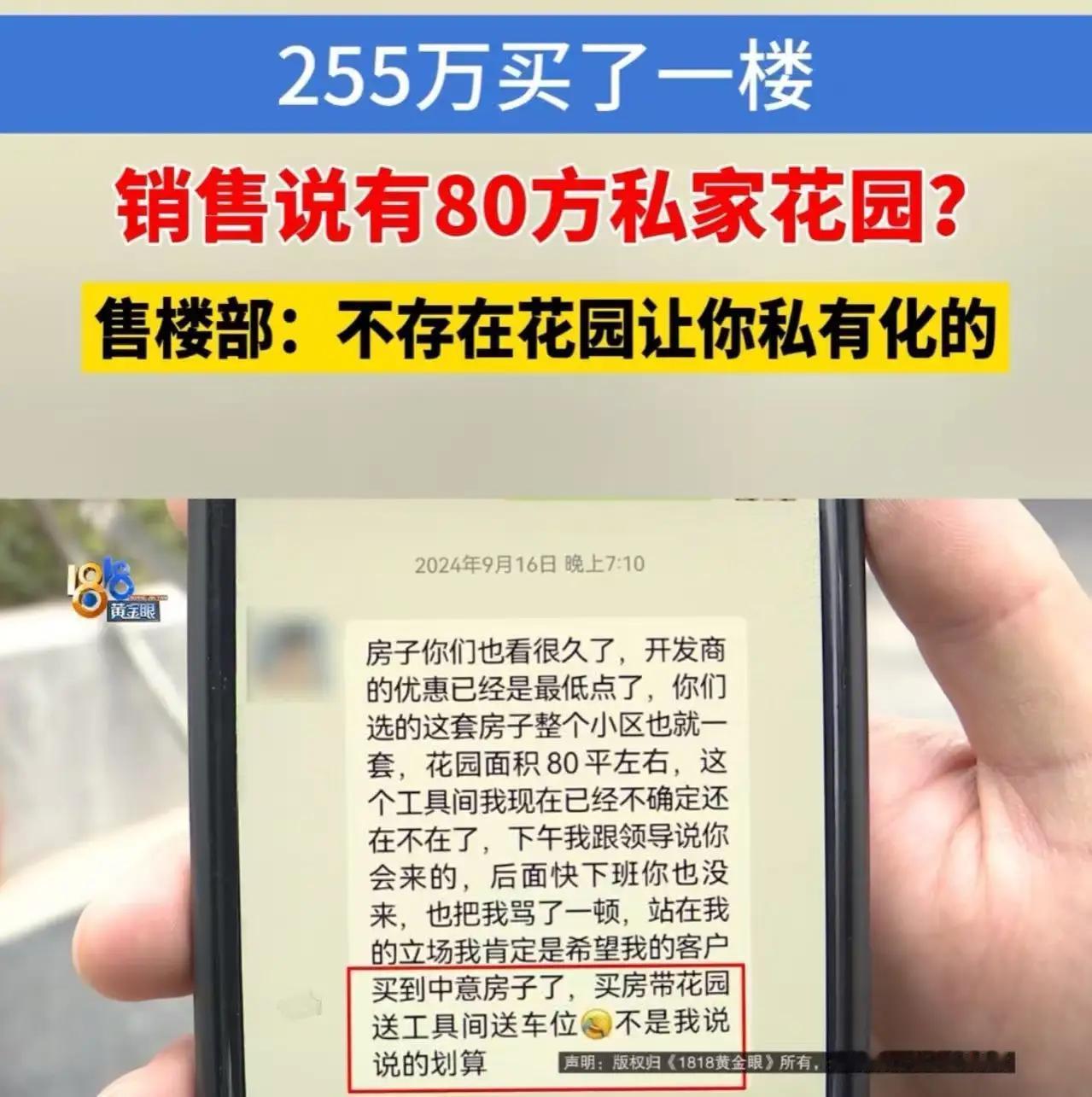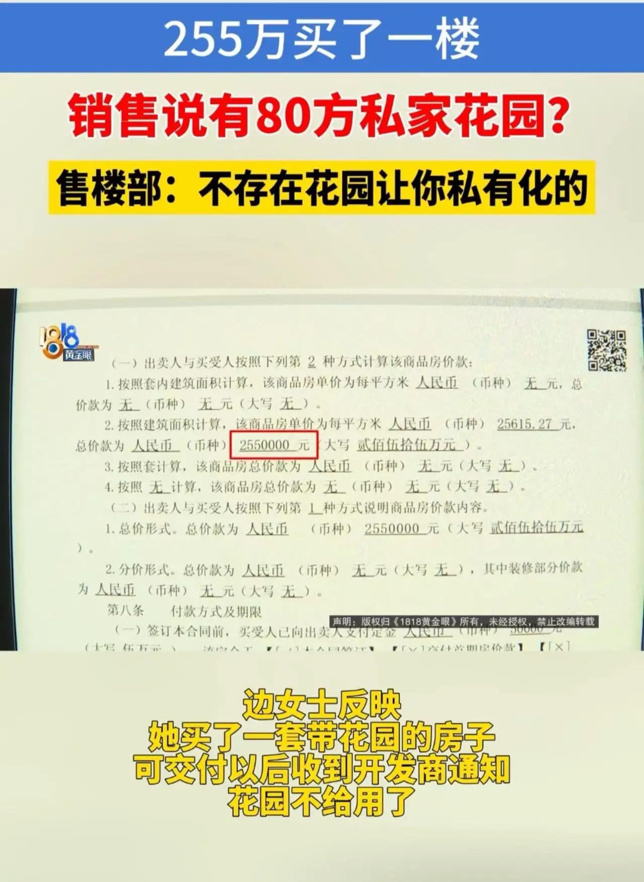 255万买一楼“私家花园”变公用?销售一句“带”不是“送”,揭开多少买房人的痛 “花255万买一楼,就是冲着80方私家花园去的,现在告诉我花园是公用的?那我图什么?” 近日,一则购房纠纷引发热议。李女士(化名)在售楼处被销售承诺“买房附赠80平方米私家花园”,为此她比楼上多付了近30万元,选择了一楼户型。然而交付后,物业一纸通知彻底击碎了她的期待:“该区域属于公共绿地,业主不得私自围挡。” 当她拿着当初的宣传资料找到开发商理论时,销售经理却给出了一个“文字游戏”式的解释:“我们说的是‘带花园’,不是‘送花园’。‘带’的意思是房屋毗邻花园,并非产权赠送。” 李女士当场气结:“如果花园是公共的,我为什么要多花几十万买一楼?这难道不是赤裸裸的误导?” 这不仅仅是李女士一个人的困境。 在无数楼盘销售话术中,“花园庭院”“绿地私享”“首层专属”这类充满诱惑力的词汇,往往游走在模糊地带。销售口头承诺的“私家花园”,到了合同里变成了“底层绿化相邻”,到了交房时又变成了“公共绿地须共享”。 为什么开发商敢如此操作? 因为根据我国《物权法》及相关规定,小区建筑区划内的绿地原则上属于全体业主共有,除非在规划时就明确为“专属庭院”并列入产权证。而现实中,极少有开发商会将一楼花园单独确权——这意味着,绝大多数“买一楼送花园”的承诺,从一开始就埋下了争议的种子。 更值得深思的是,这种销售策略精准地拿捏了人性。 谁不向往一方属于自己的小天地?尤其是在城市水泥森林中,一片能够种花种草、喝茶乘凉的“私家庭院”,击中了多少都市人对田园生活的隐秘渴望?开发商利用的正是这份情感诉求,将公共资源包装成私人礼物,让购房者为“可能性”支付巨额溢价。 李女士的质问,问出了所有吃过“模糊承诺”亏的购房者的心声:我们买的究竟是房子,还是销售精心编织的梦? 当梦想照进现实,只剩一纸冷冰冰的“公共区域”标识时,那种被欺骗、被愚弄的感觉,远比金钱损失更刺痛人心。这背后暴露的,不仅是某个楼盘销售的失德,更是整个行业在营销伦理与法律边界上的长期失范。 这件事最终会如何解决尚不可知,但它无疑给所有购房者敲响了警钟: 在掏空六个钱包之前,请务必把每一个诱人的承诺落在白纸黑字的合同里。因为当销售说“带你去看诗和远方”时,他可能只是在说——那片草地,你可以“看”,但它从来不属于你。