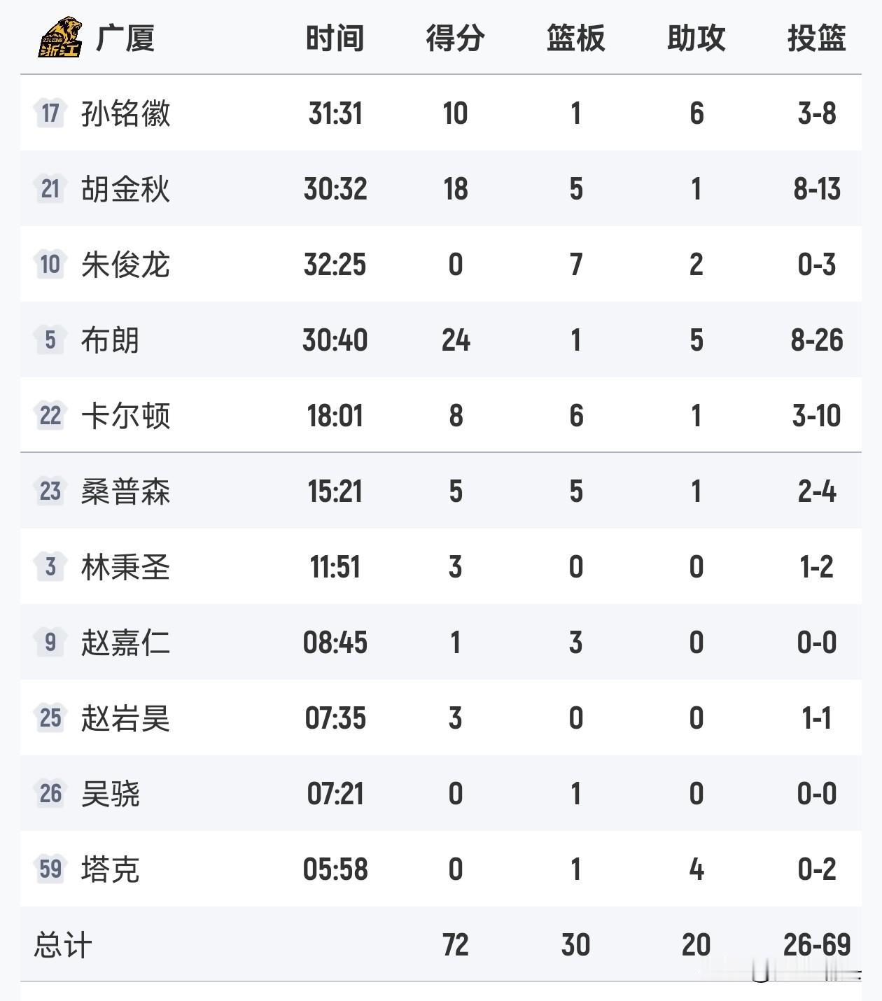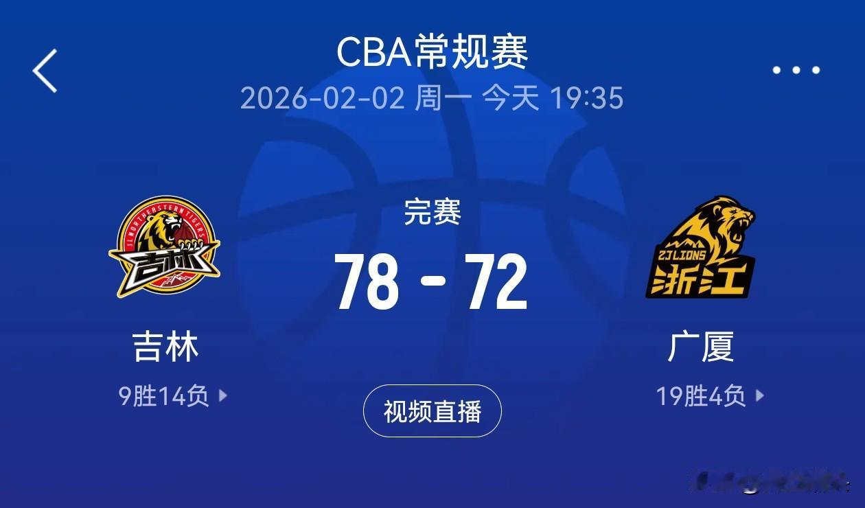 CBA常规赛第23轮爆出惊天冷门,卫冕冠军浙江广厦在客场以72-78不敌吉林男篮,本场比赛开始前浙江广厦19胜3负排名积分榜榜首,近3场比赛取得了3连胜,而吉林男篮8胜14负排名积分榜第16位,近三轮比赛没有取得胜利,赛前外界球迷一致认为浙江必将以一场大胜结束第一阶段比赛,但是今天比赛吉林男篮开局就跟广厦男篮打的有来有回,首节结束后吉林19-13领先广厦男篮,次节比赛胡金秋高效输出,吉林男篮威尔逊高效予以回应,连投带罚帮助吉林男篮半场以43-35领先,下半场以一波16-3攻击波将比分反超,但是第四节广厦集体哑火,连续7分钟内只得到了4分,吉林凭借广厦低迷发挥反超比分,最终吉林男篮主场爆冷78-72战胜广厦男篮。