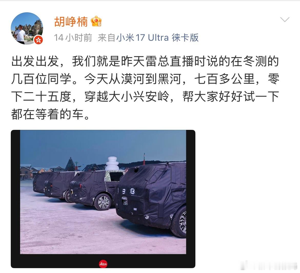 小米YU9冬测谍照曝光 2月2日消息,顺为资本投资合伙人、小米造车顾问通过微博发布一组小米大型SUV的实车伪装照,并配文透露:“出发出发,我们就是昨天雷总直播时说的在冬测的几百位同学。今天从漠河到黑河,七百多公里,零下二十五度,穿越大小兴安岭,帮大家好好试一下都在等着的车。 ”