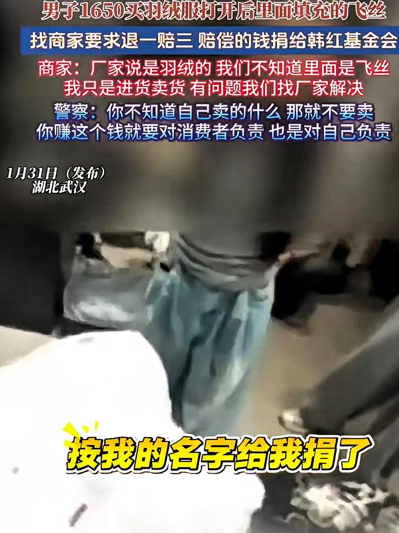近日!武汉一名男子在江汉区一家小店花1650元买了一件羽绒服,标签上写着90白鸭绒,他回家拆开内衬一看,里面塞的全是化纤飞丝,根本不是羽绒,这名男子马上带着衣服回店里找老板理论,老板却说“我只是代销的,不负责生产,把责任推得干干净净。 男人没有吵闹,直接打电话报警,警察到场后,他提出根据消费者权益保护法要求退一赔三,总共4950元,但加了一个条件:这笔钱不能给他自己,要让店主用自己的名义捐给韩红基金会,老板刚开始有点犹豫,警察就在旁边看着,最后他还是通过扫码当场完成了捐款,整个过程有人拍了视频传到网上,很多人都说这个男人做事硬气又讲道理。 第二天,市场监管局接到举报后上门检查店铺,他们查验货物时发现,标签上写着填充物是90%鸭绒,但实际填充物几乎全是化纤,连30%都不到,于是这家店被责令停业整顿,相关进货渠道也被追查,这种情况其实挺常见,很多小服装店自己没有工厂,从外地小作坊那里拿货,标签随便贴上去,因为顾客一般不会拆开来看。 有意思的是,这个人没有选择通常的维权方式,他没有在网上发帖子骂人,也没有找媒体曝光这件事,而是把赔偿变成了一次公开的善意行动,钱没有进自己的口袋,反而转进了公益账户,等于是把被骗的委屈转化成了对社会的补救,网友称这种做法为“温柔的硬核”,听起来有点矛盾,但真有人这么做了,还取得了成功。 后来市里发出紧急通知,开始检查冬季服装的填充物标签,韩红基金会也转发了这件事,并说每一份善意都应该被认真对待,现在市场上的假货确实不少,但真正让人记住的不是那些喊得最响的,而是那些做得最稳的。