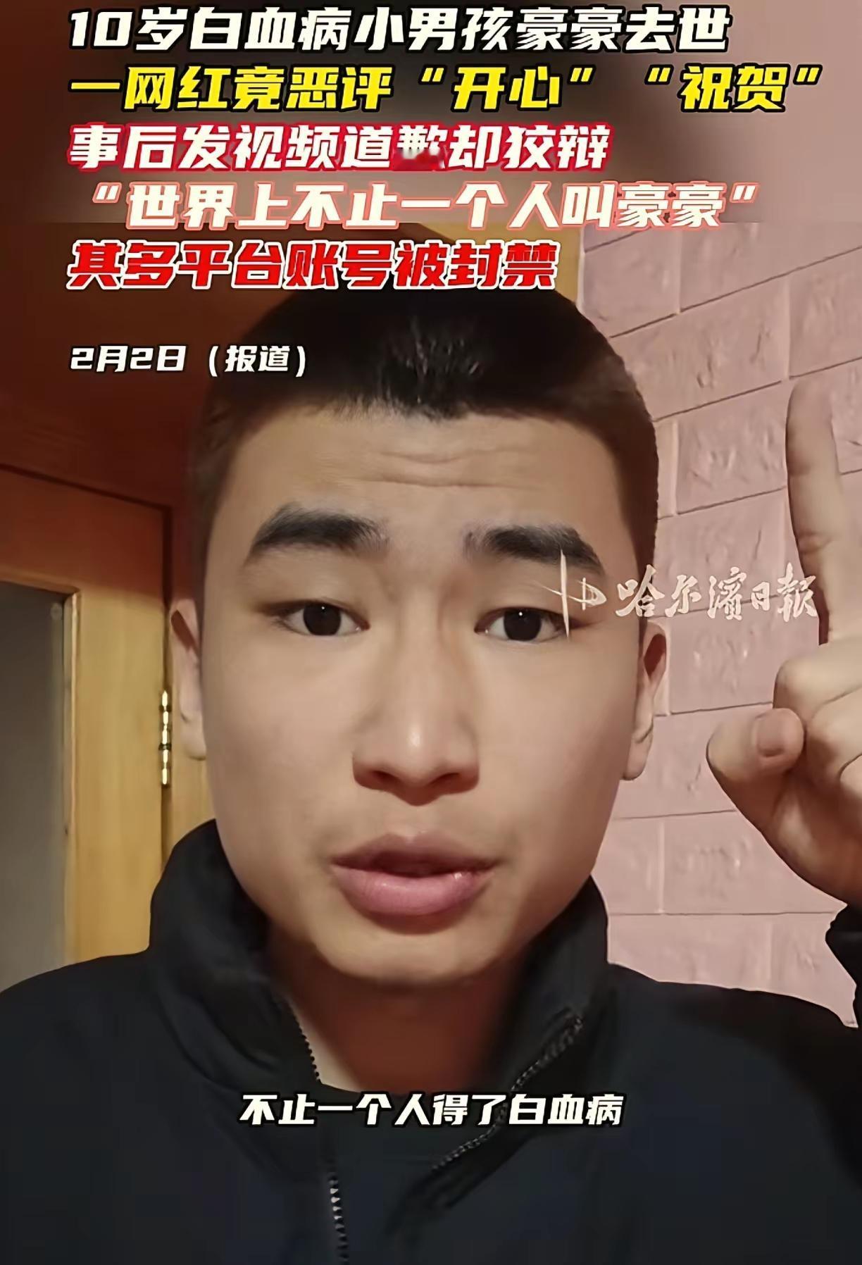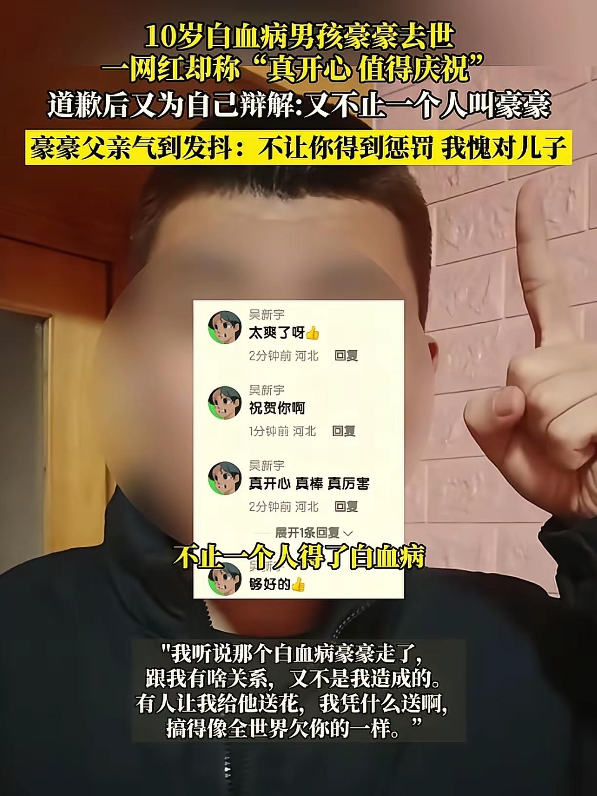 你是在挑战全国网友的底线吗? 前段时间白血病豪豪离开了这个世界。 小编也是关注豪豪有几年的时间了,他是一个可怜的孩子,同样是做父母的。 谁不希望自己的孩子能够开开心心健健康康的生活。 而豪豪一直在医院中度过,很多吃的不能吃,喝的不能喝,反反复复的治疗,让任何人都心疼这位宝贝。 在他离开后豪豪的父母也是发了视频告诉大家豪豪走了,评论区中更是满是不舍,却有一位网红叫做“吴某宇”的,竟然公开蹭流量,并且在评论区中评论“开心祝贺”。任谁看了,谁不恼火。 为此全网也开始声讨这位素质低下的博主,豪豪的父母更是表示“如果不让他受到惩罚,真的是愧对自己的孩子”。 事发后,网络平台也是很严谨,对待此事,吴某宇即便是对外进行公开道歉,但也无济于事,全平台进行对其账号进行封闭。 有些流量能蹭,有些却不能,光是看这个男子的面相就知道这人不像是什么好人。对此你们怎么看?