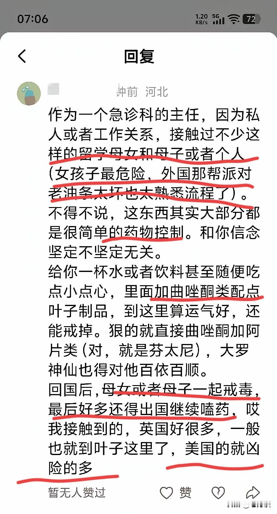 急诊科主任医生谈到,留学的女学生和陪读母亲为什么到了国外就容易变呢,除了自身的原因,还有就是容易被外国人轻轻松松,通过简单的药物控制来达到他们的目的。因为这位医生接触到很多有留学经历的女学生或者母女。外国人对于我们去的留学生群体实在是太了解了,他们就是简简单单通过药物控制进行侵犯。即使你有再坚定的信念,可能都难以抵挡药物的作用。而且这种药物容易上瘾,即使你在一定的机会的时候能够戒毒,但是很容易复发,很容易就吸吸复吸吸,让你陷下去,最终让你走上一条不归路。所以出门在外,特别在国外的时候,即使你的定力非常的好,千万也不要去参加聚会,更不要去酒吧,而应该呆在学校宿舍。尽量减少与众人的Party, 这样才能减少中招的可能。