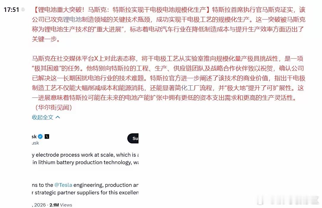 重大利好!明天A股的炒作路线基本已经明确了?盘后马斯克在社交媒体平台X上表示“特斯拉实现干电极电池规模化生产”,他特别向特斯拉的工程、生产、供应链团队及战略合作伙伴致以祝贺,确认公司已解决这一长期困扰电池行业的技术难题。随后特斯拉公司也确认了这一点。干电极电池规模化生产无疑对于推动固态电池快速落地有巨大的促进作用,现在马斯克又公开对此进行了表态和祝贺,我想明天A股怎么走,懂的应该都懂吧?马年跟老马,看老马的风向,无疑在大A已经默默形成了一种共识。而且客观来说,干电极电池规模化生产确实也是一个重大突破。众所周知,固态电池的商业化之路,有两座大山,一个是“固-固界面”,另一个就是“成本”。而干法电极技术,是同时推翻这两座大山的最优路径之一。所以现在特斯拉正式攻破了这个难题,也难怪马斯克都要公开表示祝贺,是有道理的。所以明天A股的炒作路线是不是明确了?