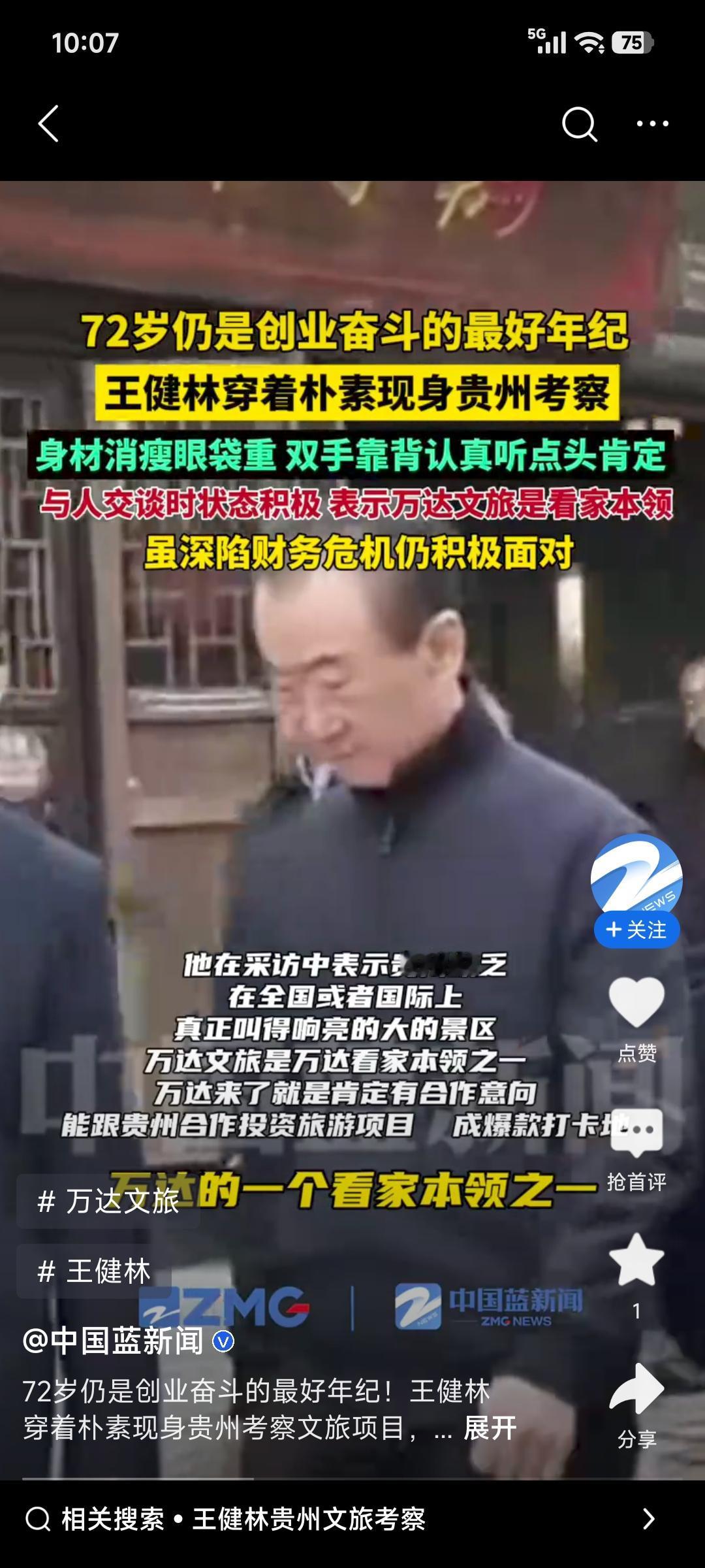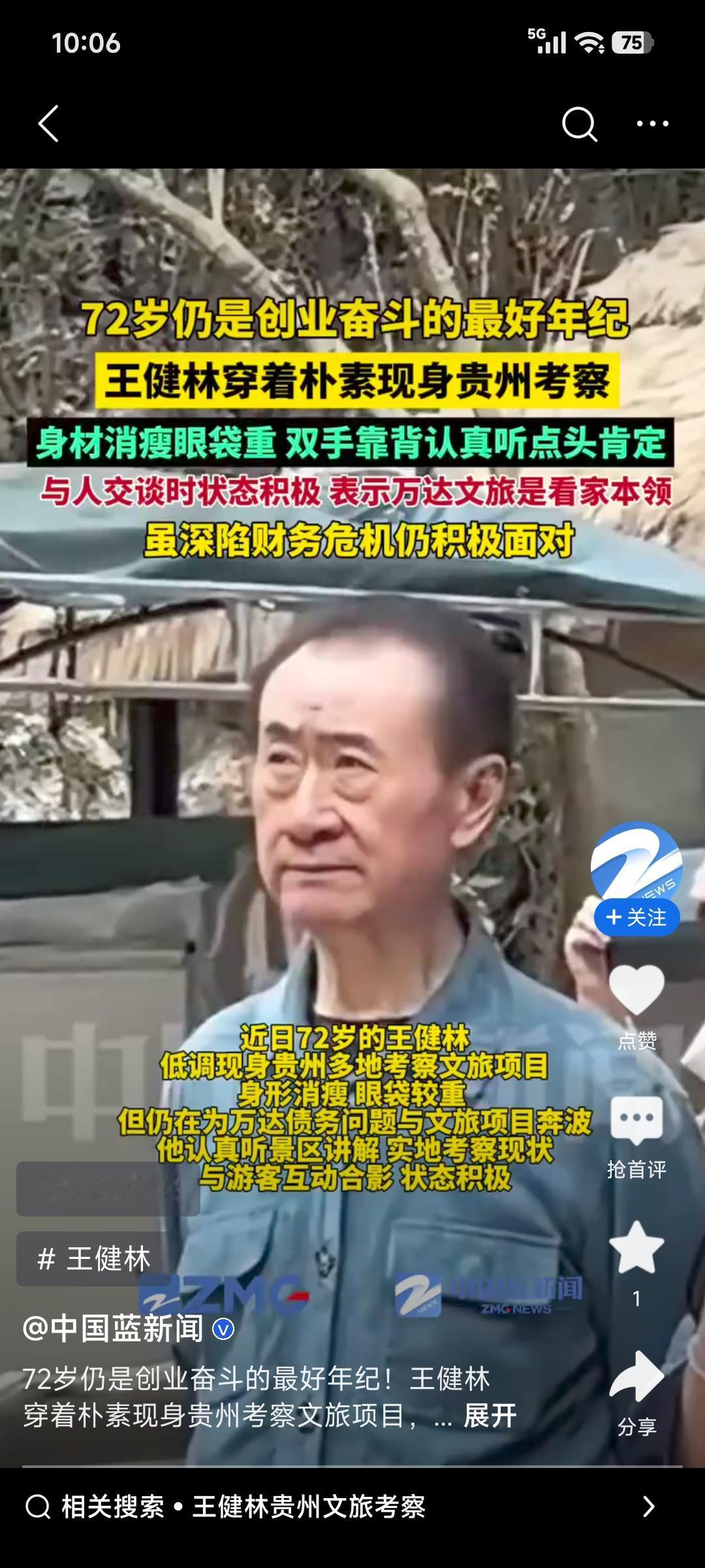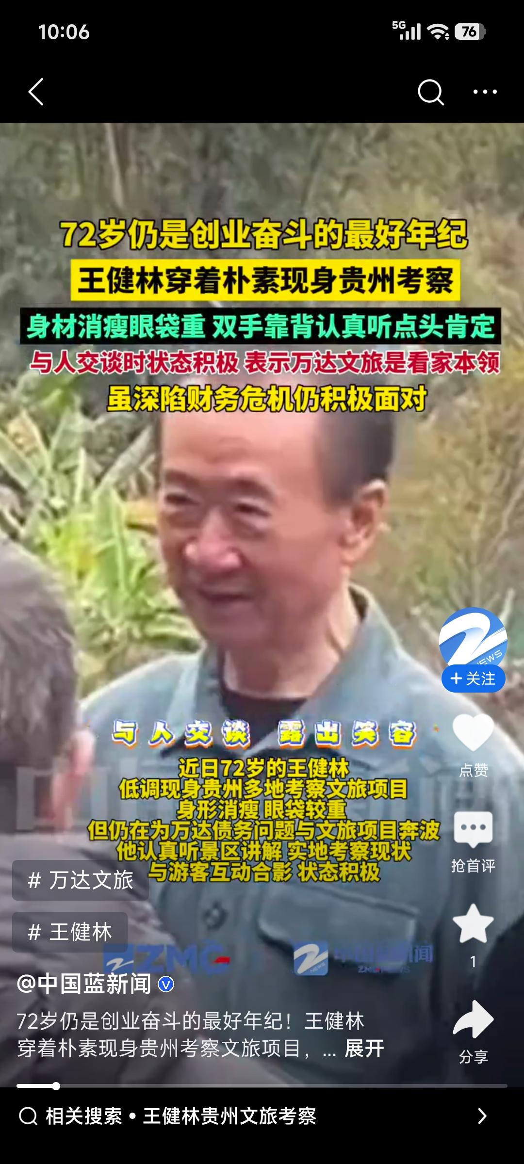 71岁的王健林又开始行动啦!近日他低调现身贵州考察,先后走访罗甸大小井风景区、花江峡谷大桥等。照片里他身形消瘦却姿态挺拔,专注考察细节。 万达和贵州早有渊源,丹寨万达小镇就是文旅扶贫标杆。当下万达聚焦文旅转型还背着债务压力,这次考察估计是想复制丹寨经验,抓住贵州“桥旅融合”的风口找新增长极。其实去年8月他就去新疆考察文旅项目了。为化解债务,万达这些年没少卖资产,今年还卖了一座万达广场。这老企业家这么拼,真让人期待他能带领万达成功突围!