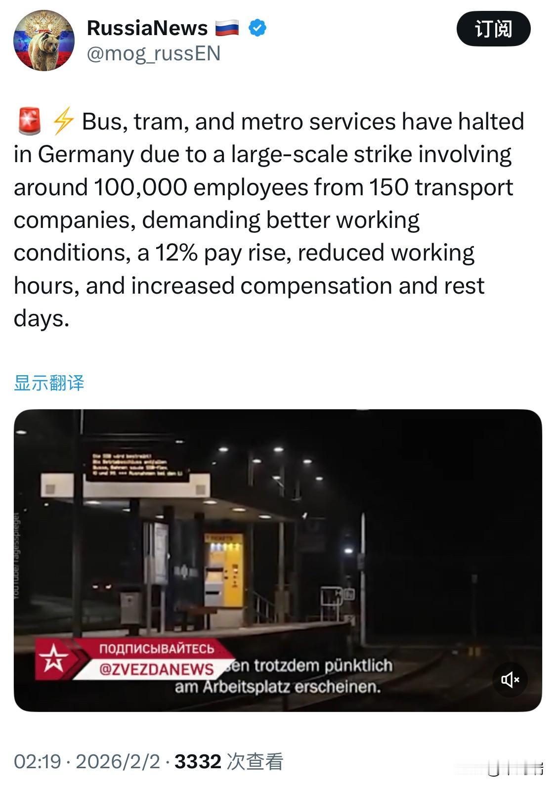 根据最新消息,德国主要工会 Ver.di 呼吁全德范围内约 150 家 市政交通公司的 10 万名 员工于 2026 年 2 月 2 日(周一) 举行大规模警告性罢工。 罢工导致德国除下萨克森州外的 15 个联邦州内的公共汽车、有轨电车和地铁服务大面积停止。 受影响城市包括柏林、汉堡、慕尼黑、科隆、法兰克福、斯图加特等主要大都市。 运行正常的服务:由于员工不隶属于此次罢工的工会,由德国铁路 (Deutsche Bahn) 运营的城市快铁 (S-Bahn)、区域列车以及长途列车预计将照常运行。 工会核心诉求 由于劳资谈判陷入僵局,工会提出了以下要求以改善目前面临的人员流失和工作压力问题: 缩短工作时间:减少每周工作时长和轮班时间。 增加休息时间:要求更长的休息时段和带薪休假。 提高薪酬与补贴:在部分州要求加薪约 10%-12%,并增加夜班、周末及公共假期的奖金。 后续安排 恢复时间:预计交通服务将于 2 月 3 日(周二)凌晨 逐步恢复正常运营。 下一轮谈判:双方暂定于 2 月 9 日 举行下一轮集体薪资谈判。如果谈判未取得实质性进展,工会警告不排除采取进一步的行动。