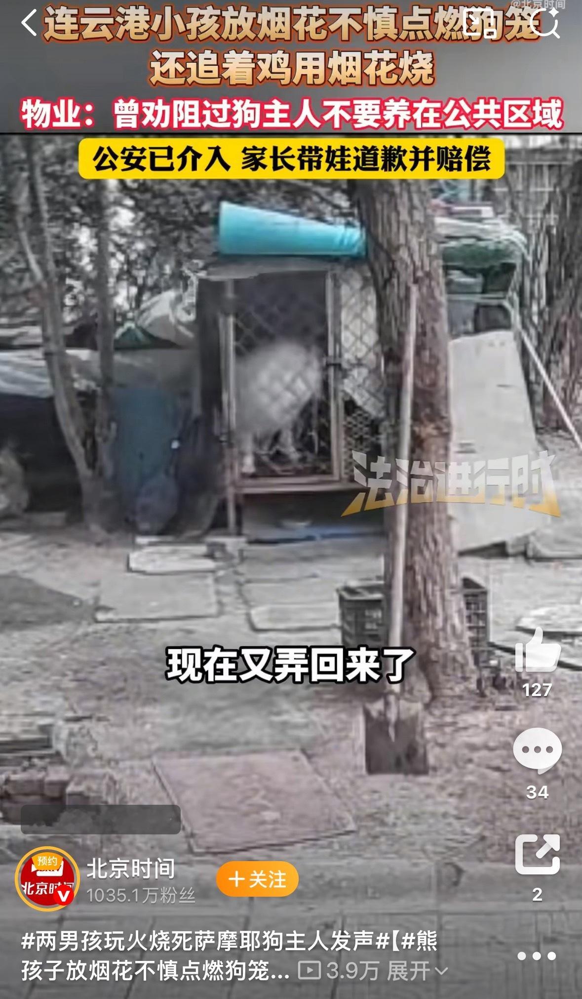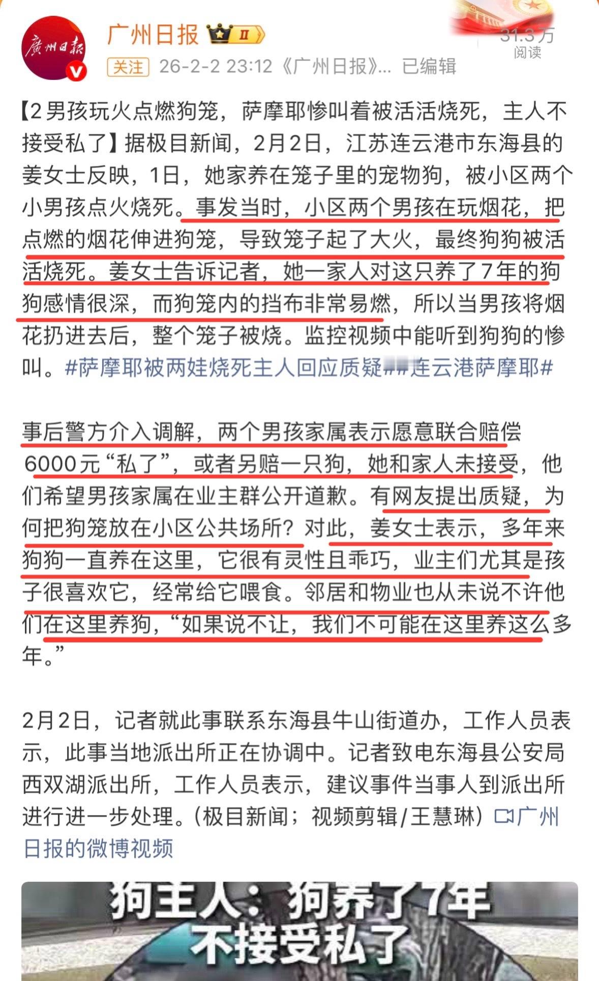 萨摩耶被两娃烧死主人回应质疑这个事吵了快一天了,吐槽一下:俩娃是故意的吧?不一定。能不能按纵火罪?没办法。狗主人说不能私了怎么办?没办法。
