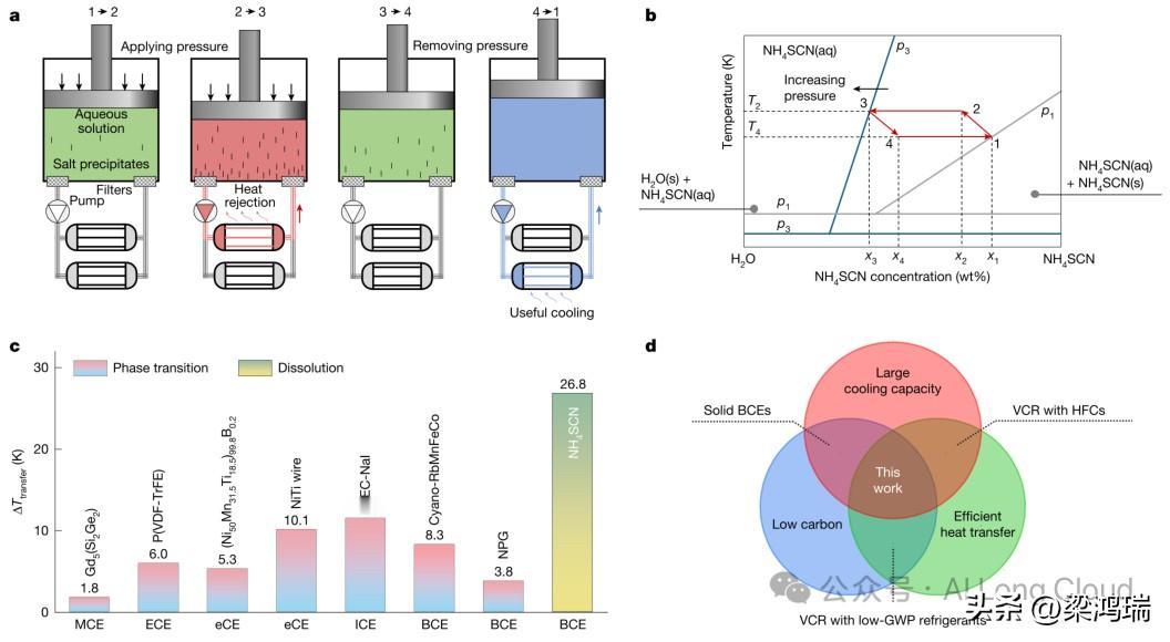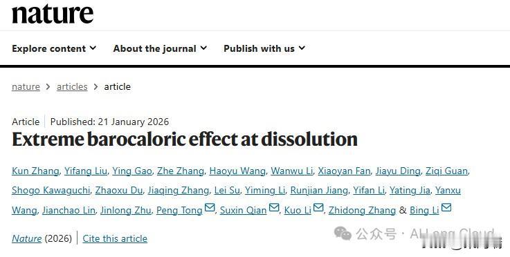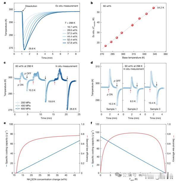 近日,中国科学院金属研究所等在制冷技术领域取得突破——首次发现“溶解压卡效应”,有望同时攻克制冷领域的低碳排放、大制冷量和高换热效率三大核心挑战。 金属所研究团队在实验中发现,硫氰酸铵(NH₄SCN)溶液在压力变化下表现出惊人的热效应:加压时盐析出并放热,卸压后盐迅速溶解并强力吸热,室温下溶液温度可在20秒内骤降近30°C,在高温环境下降温幅度更高,远超已知固态相变材料性能。这一现象被命名为“溶解压卡效应”。 该效应将制冷工质与换热介质合二为一:利用溶液本身流动性实现高效传热,同时通过溶解/析出过程提供巨大冷量,从而一举打破长期以来困扰制冷领域的“低碳—大冷量—高换热”不可能三角关系。 基于此效应,团队设计出一套高效的四步循环系统:加压升温→向环境散热→卸压降温→输送冷量,单次循环即可实现每克溶液吸收67焦耳热量,理论效率高达77%,展现出优异的工程应用潜力。 在数字经济快速发展的当下,算力已成为关键基础设施,其背后伴随的是巨大的能源消耗与散热挑战。而数据中心的冷却系统能耗约占其总用电量的40%。传统压缩机制冷不仅能耗高、排放量大,而且在处理高功率密度散热时,换热效率也面临瓶颈。 这项研究不仅提供了一种全新的制冷原理,更为发展高效、环保、可扩展的下一代制冷技术奠定了关键科学基础。 溶解压卡效应是一种利用压力调控溶液溶解/析出过程实现高效制冷的绿色制冷技术,它是一种全新的制冷技术,由中国科学家于2026年首次发现。其核心原理是通过压力变化驱动溶液(如硫氰酸铵水溶液)发生溶解吸热或析出放热,实现快速降温:加压时盐析出放热,卸压时盐溶解吸热,室温下20秒内可降温近30°C。能同时解决制冷领域的三大难题:低碳排放、大制冷量和高换热效率,打破了长期以来被认为“不可能”的三角关系。 ➕核心原理:它利用了压力变化来调控溶液的溶解和析出过程,从而实现吸热和放热: ★加压时:盐(如硫氰酸铵NH₄SCN)从溶液中析出(盐析),这个过程会放热。 ★卸压时:盐迅速溶解回溶液,这个过程会强力吸热,导致溶液温度在20秒内骤降近30℃。 ➕关键突破 ★破解“不可能三角”:首次实现了制冷领域的“低碳-大冷量-高换热”三者兼得。 ★高效节能:理论效率高达77%,单次循环每克溶液就能吸收67焦耳热量。 ★绿色安全:使用的是水溶液,不涉及碳排放,环保又安全。 ➕应用前景这项技术有望在数据中心散热、特种制冷设备、工业冷却等领域带来革命,未来可能会用于更节能的空调和冰箱。 简单来说,它就像用“盐水海绵”制冷:加压挤出盐水放热,卸压吸回盐水吸热,效率高又环保。 该研究由中国科学院金属研究所的李冰研究员团队牵头,与合作者共同完成。主要作者包括张昆、刘贻芳、高应、张哲等。 这篇题目为《Extreme barocaloric effect at dissolution》的论文于2026年1月21日在线发表。它也被收录在《自然》杂志2026年1月29日出版的第649卷第8099期中。
