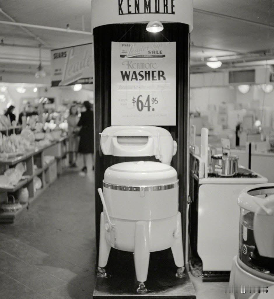 1941年,纽约州锡拉丘兹市的一家西尔斯·罗巴克百货商店正在出售一台全新的Kenmore牌绞干式洗衣机,售价为64.95美元。在当时,这是一笔不小的投资,相当于今天的近 1,200 美元。 关于洗衣机 类型: 这是一台绞拧式洗衣机(wringer washer),衣服洗完后需要手动通过顶部的滚筒挤干多余的水分。 特点: 这款洗衣机具有电动洗涤功能和耐用的结构,在当时代表了家务便利性的一大进步。 历史背景: 它是“自动洗衣机”的前身。虽然在 1941 年是先进技术,但到了 20 世纪 60 年代初,大多数地方已经转向了具有自动注水、搅拌和甩干循环的现代自动洗衣机。 制造商: Kenmore 是 Sears 的自有品牌,这款洗衣机很可能由 Whirlpool 等制造商代工生产。