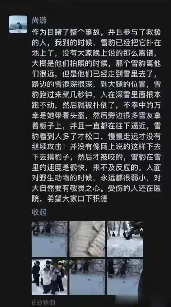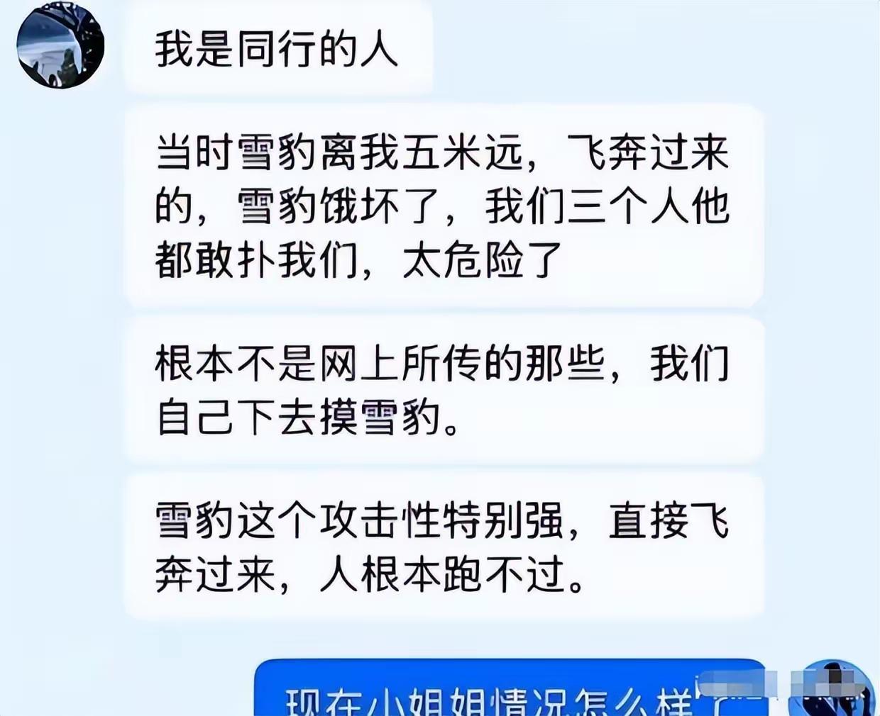 最后都没想明白,这女子真不知道雪豹的速度吗? 这女子在旅游,众人都在大巴车上等待离开,并且在旅游景点已经是提示了有雪豹出没。 这些对她来说都是没用的提示,完全是不顾这些温馨的提示,非要前往拍摄雪景,好吧,到头来还是被雪豹袭击,要不是现场救援及时,女孩的命都能交代在这。 那看到这个消息的时候,我还以为是女孩自己没事找事,可是在看到自拍后,我真的是服了。 先说这自拍,有同行人表示,三个人拍摄雪景,这雪豹就就离他们五米,真的胆子大,五米什么概念,在雪豹的眼中,五米岂不是一个跳跃就过去了。 或者说是你眨眼的功夫,雪豹就能够跑到你面前,加上雪很厚,人的动作又慢,所以说根本就没有反应的时间。 不管怎么说吧,受伤了也就给自己长个教训,这野生动物不是家里的猫狗。容不得你松懈。