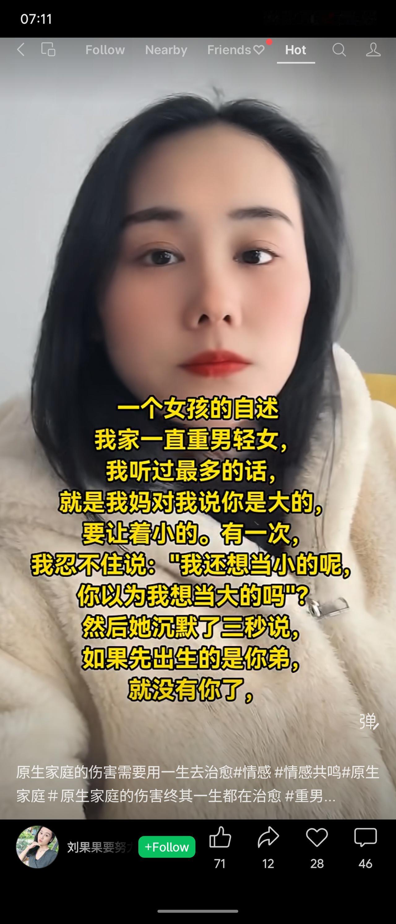 女孩在重男轻女家庭中成长,常被要求“让着弟弟”。她反问母亲“不想当大的”,母亲却说若弟弟先出生便不会有她。她感慨原生家庭的伤害需用一生治愈。