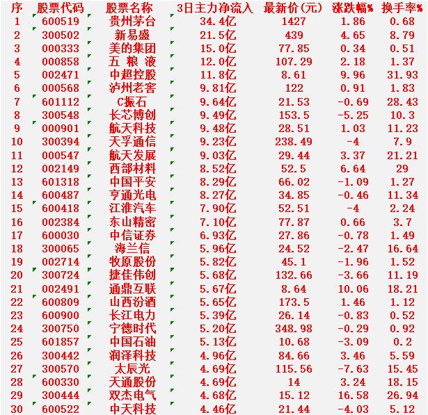 2月3日,前3天主力大幅买入的30名单! 贵州茅台:3日净流入 34.4亿元,涨跌幅 +1.86% 新易盛:3日净流入 21.5亿元,涨跌幅 +4.65% 美的集团:3日净流入 15.0亿元,涨跌幅 +0.34% 五粮液:3日净流入 12.0亿元,涨跌幅 +2.18% 中超控股:3日净流入 11.8亿元,涨跌幅 +9.96% 泸州老窖:3日净流入 9.81亿元,涨跌幅 +0.91% C振石:3日净流入 9.64亿元,涨跌幅 -0.69% 长芯博创:3日净流入 9.49亿元,涨跌幅 -5.25% 航天科技:3日净流入 9.48亿元,涨跌幅 +1.03% 天孚通信:3日净流入 9.23亿元,涨跌幅 -4.00%