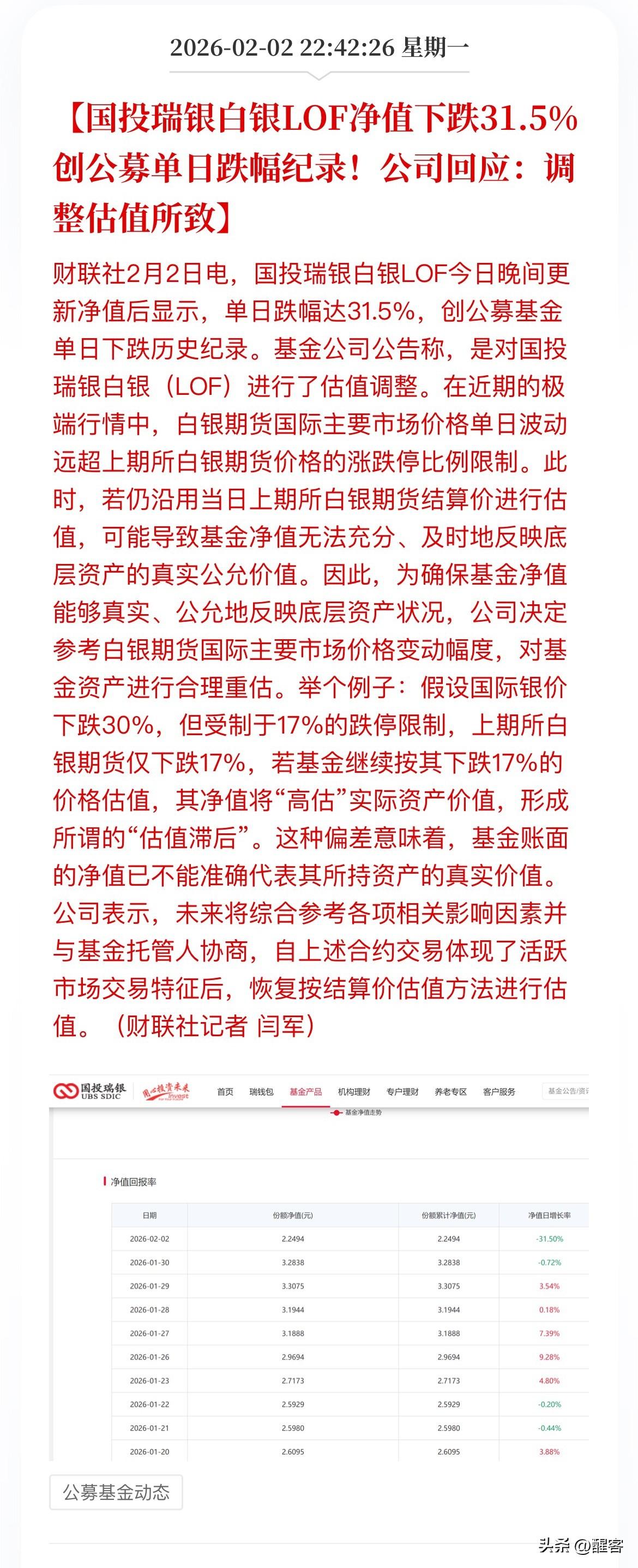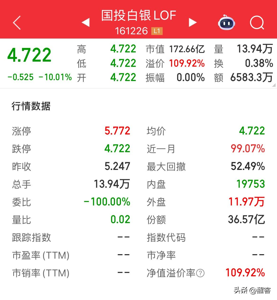 国投白银LOF的这则公告和估值调整后直接将溢价率飙升至109.92%,原本以为按照之前59%的溢价率3个涨停就可以止住。 按照涨的时候不按国际银价接轨,跌的时候又同步的“不讲武德”的做法,这下子没有7个以上的跌停是万万如何都出不来了。