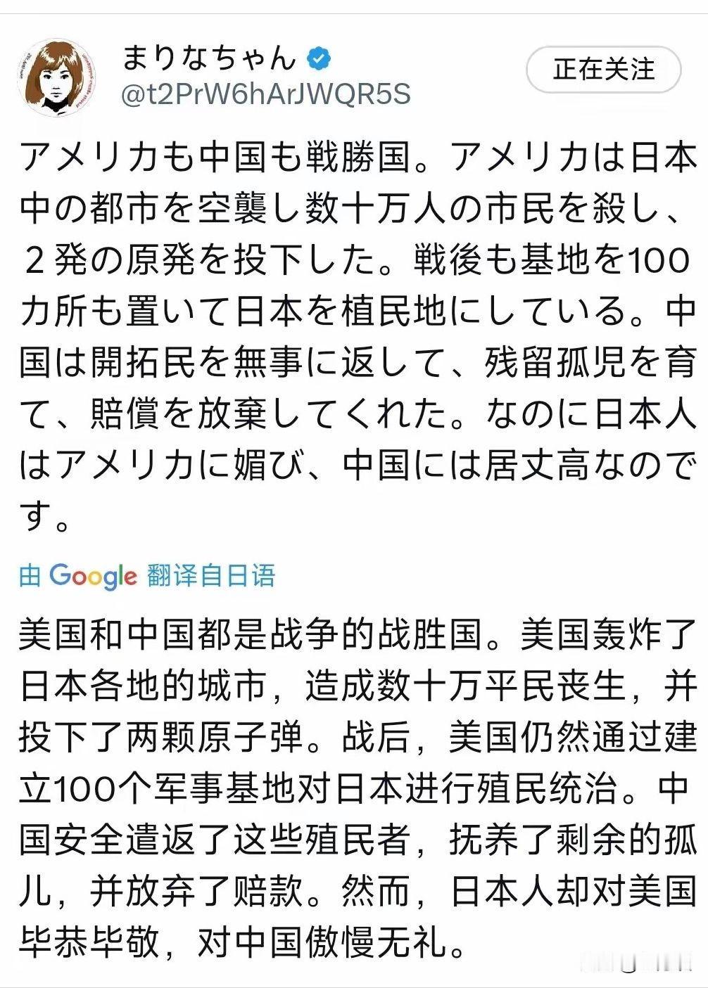 部分明事理的日本人已经觉醒了。有日本人写道,中美两国都是二战战胜国,美国在日本投了两颗原子弹,对日本进行殖民统治。中国遣返了所有的殖民者,并且抚养了日本在华的遗留孤儿,并放弃了赔款。那个日本人却对美国毕恭毕敬,对中国人却傲慢无礼。 这究竟是因为什么原因?对日本如此之好,他们居然如此的傲慢无礼,而美国对日本如此的残忍的殖民统治,他们却能对美国人毕恭毕敬,这是日本人的性格使然,对强者俞强,对弱者更加的傲慢,因为在他们的意识当中,日本是因为美国而战败,而不是被中国战败,所以他们对于强者美国是仰起脖子仰望,而对中国并不服。所以他们才会出现如此截然相反的态度,他们并不会因为你对他好,就对你毕恭毕敬,你只有比他们强,只有把他们制服了,他们才会对你毕恭毕敬,而且会认为是理所当然。