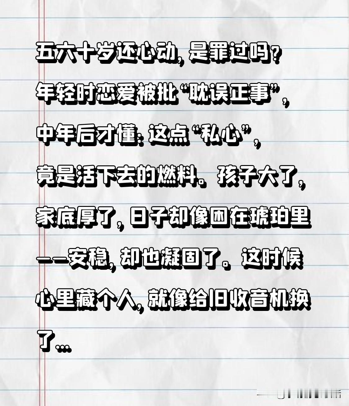 五六十岁还心动,算罪过吗? 年轻时恋爱被指“耽误正事”,中年后才明白,这点“私心”是生活的动力。孩子长大、家底渐厚,日子安稳却如琥珀般凝固。 心里藏个人,如给旧收音机换新电池,又能听见歌声。不必相伴、无需告白,看到桃子、听到老歌就会想起。少年爱似爆炒,中年情如煲汤。 我们怕心长皱纹,怕生活重复、灵魂冬眠。那份惦记是心底的春天,让人注重外表、保持身材。 前半生为他人活,后半生这点“不正经”是命运给的利息。它牵魂提醒:血有温度,眼会发亮。 心未老,爱不止。你有让你眼角生辉之人吗?评论区告诉我。 四五十岁的感悟 五六十岁的爱情 五十岁爱情观 中年男女的清醒