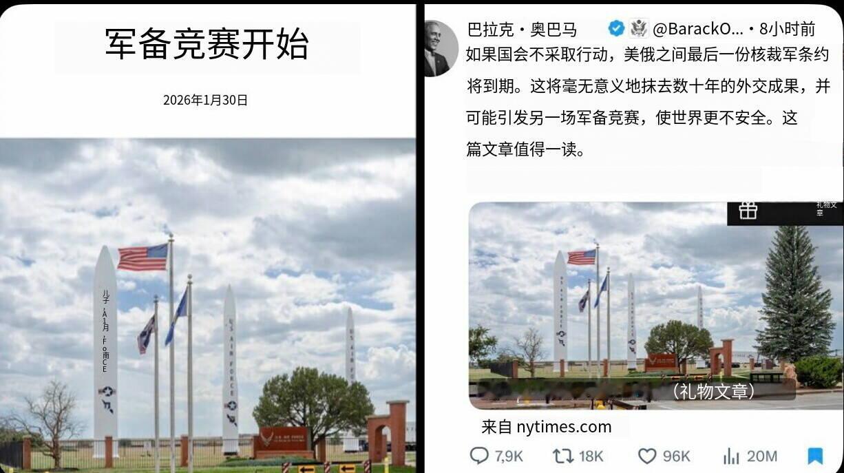 新闻快讯——美俄核军控条约到期倒计时,奥巴马警告军备竞赛风险! 2026年2月3日,俄罗斯总统特别代表基里尔·德米特里耶夫(Kirill Dmitriev)发文警告,美国若不批准延长《新削减战略武器条约》(New START),将使美俄失去最后一项核军控协议,重启核军备竞赛。 美国前总统奥巴马同日转发《纽约时报》评论文章《Let the Arms Race Begin》,呼吁国会立即采取行动。他表示,若条约在2月5日到期失效,数十年的外交成果将付诸东流,世界将陷入更危险的核对抗格局。 目前,俄罗斯已提出延长条约核心限制条款一年的倡议,但美国国会尚未批准相关法案,特朗普政府对续约态度消极,全球战略稳定正面临冷战结束以来最严峻的考验。