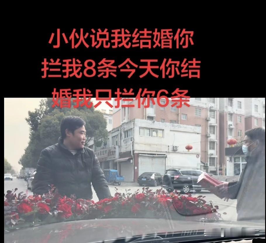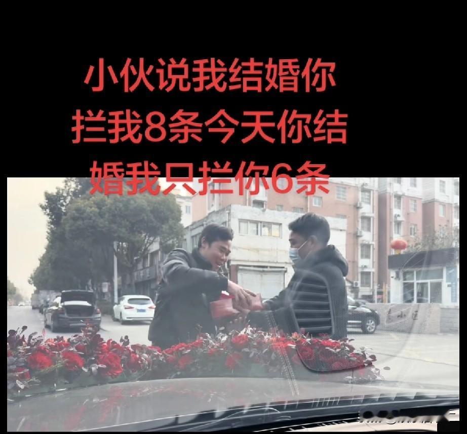 沐阳拦婚车要烟小伙太搞笑了,要完烟之后还去参加了婚宴,就是不知道随礼了没有? 前几天刷到一个视频,一个小伙拦在婚车面前问新郎要烟。 新郎的家属拿了两条烟给他,而他并不满意,直到又给了四条才满意的走开。 大家非常讨厌这种陋习,却发现这个小伙并没有看上去那么蛮横,反倒是有点不好意思。 原来他并不是无故拦车,而是想要把当年的面子找回来。 很快网友们找到了他当初结婚的视频。 那还是在2021年,就当他去接新娘的时候被人拦下,这个要结婚的新郎始终不放他走,最后给了八条烟才放他离开。 当时小伙还显得很年轻,西装革履的,被人拦在路上,脸上更是充满了无奈。 网友知道内情后完全赞同小伙的做法。 而且觉得他要六条烟实在太少了,当初他给了八条烟,这么多年过去了,最少也得要十条烟。 也能看出这个小伙做人其实挺厚道的,并没有故意为难新郎。 搞笑的是,他还去参加了这家人结婚的宴席,他也成为整个宴席里最大的亮点。 他坐在那里一直傻笑,本来就不是烟的事,就是为了一口气,多年前的心结终于打开了,心里自然很高兴。 俗话说的好“君子报仇,十年不晚”,网友们全在评论区表示干得漂亮。