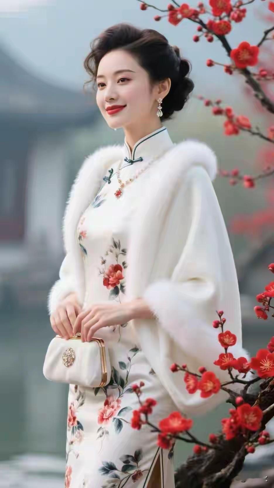 旗袍典雅佳人立, 恰似仙姿落人间。 嫣然一笑百媚生, 恰似春风拂柳轻。