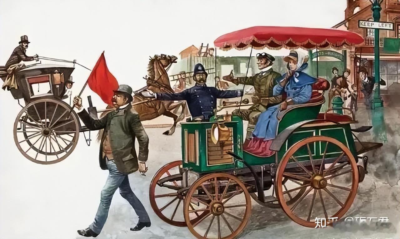 红旗法还是为在英国考文垂汽车博物馆看到的,1865 年英国颁布《机动车法案》(即红旗法),要求汽车行驶时前方必须有一人举红旗步行,时速不得超过 4 英里(约 6.4 公里),城镇内甚至不得超过 2 英里。